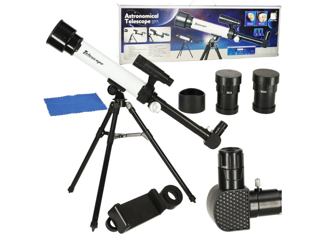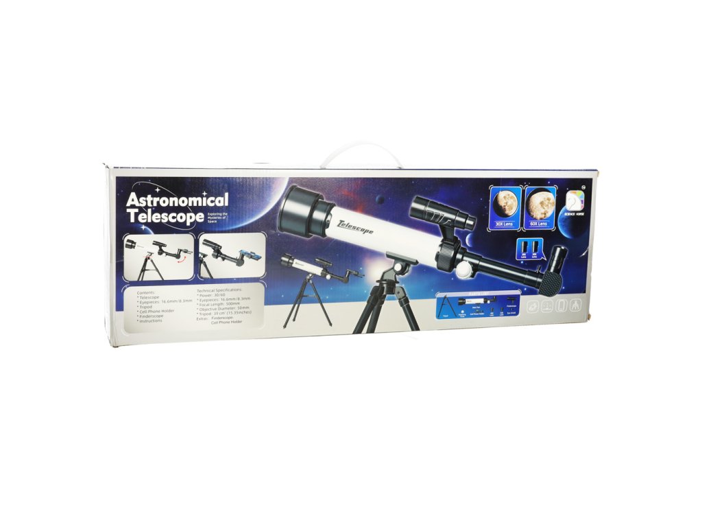 Vzdělávací astronomický dalekohled umožňuje dětem pozorovat oblohu a vzdálené objekty. Dva vyměnitelné okuláry se zvětšením 30x a 60x umožňují uživateli nastavit zvětšení podle svých potřeb. Stativ poskytuje stabilitu, takže je snadné přesně umístit dalekohled a pohodlně pozorovat objekty. Vestavěný kompas pomáhá rychle nasměrovat dalekohled správným směrem. Držák na telefon umožňuje dětem umístit zařízení vedle objektivu, což jim umožňuje nejen pozorovat obraz na obrazovce, ale i fotografovat.
