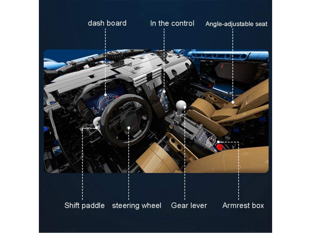 Pod přední kapotou je luxusní zavazadlový prostor. Otevíratelné dveře umožňují přístup k interiéru, který je vyroben do nejmenšího detailu. Model má např. nastavitelná dvojitá sedadla, volant, zpětné zrcátko, skříň loketní opěrky, ovládací panel a řadicí páku. Volant je založen na předním panelu pro snadný přístup k manuální jízdě.