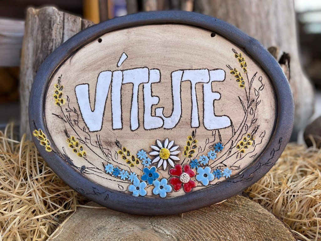 Keramická cedule Vítejte s motivem lučního kvítí je milým a stylovým doplňkem ke vstupu do vašeho domu, na chalupu nebo na zahradu 🌸🏡.