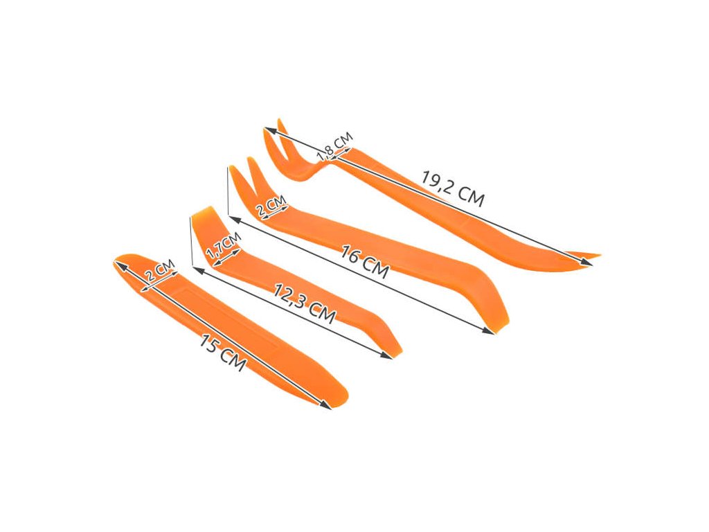 - Skládá se ze 4 lžic různých délek a tvrdosti a je ideální pro rozebírání různých typů plastových prvků připevněných západkami, např. čalounění auta, spony do auta, TV dálkové ovladače, elektronické zařízení a další.