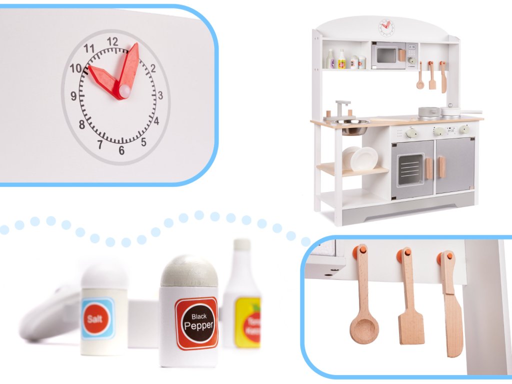 Hraním na kuchaře si děti rozvíjejí fantazii a manuální dovednosti. Dřevěná kuchyňka na hraní bude mít také vzdělávací hodnotu tím, že batolata naučí o každodenních pracích, jako je mytí nádobí po jídle, a také o bezpečnosti při vaření.