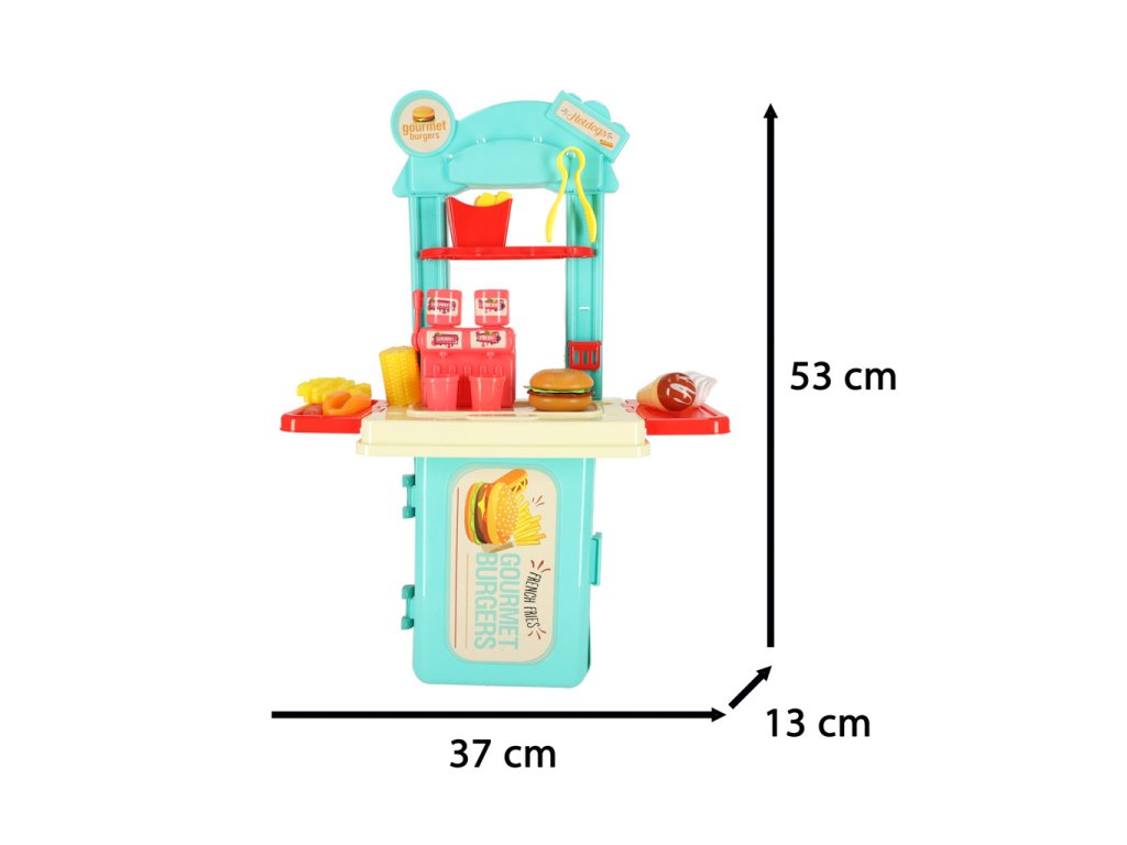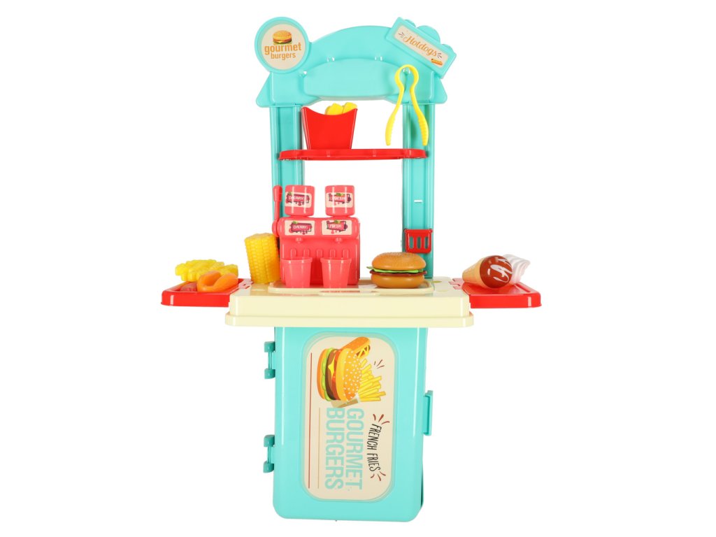 Modrá dětská kuchyňka je hračka, která vtáhne nejmenší do kreativního světa vaření! Umožňuje dětem hrát si na majitele stánku s jídlem a servírovat burgery, hranolky, párky v rohlíku nebo zmrzlinu.