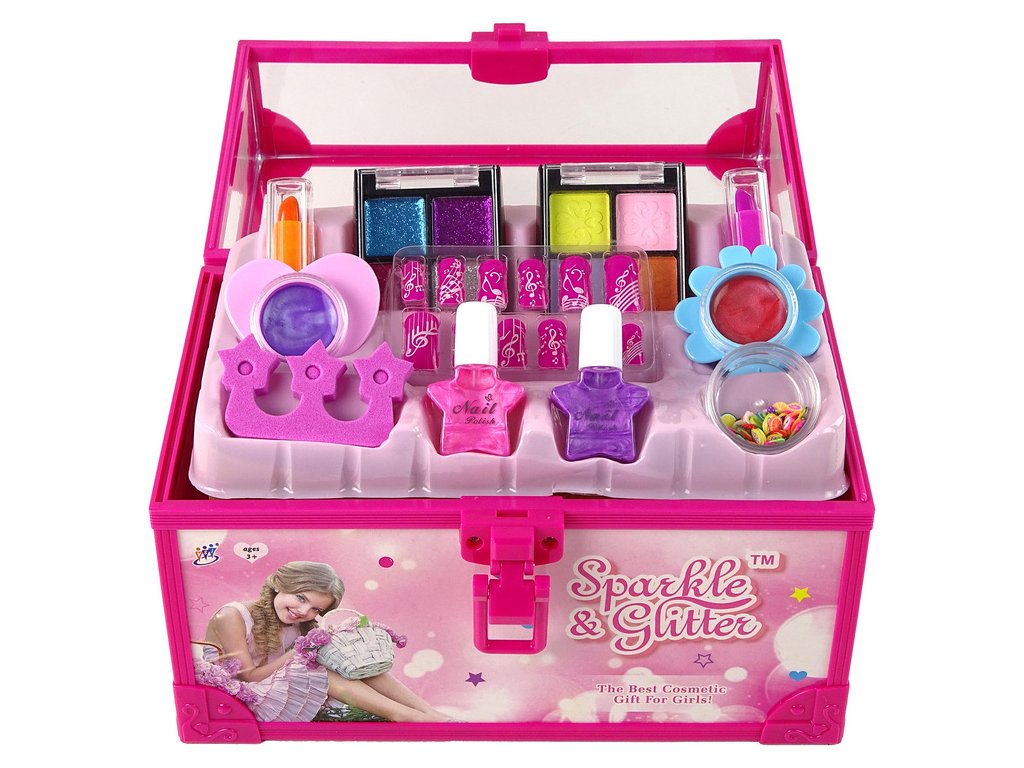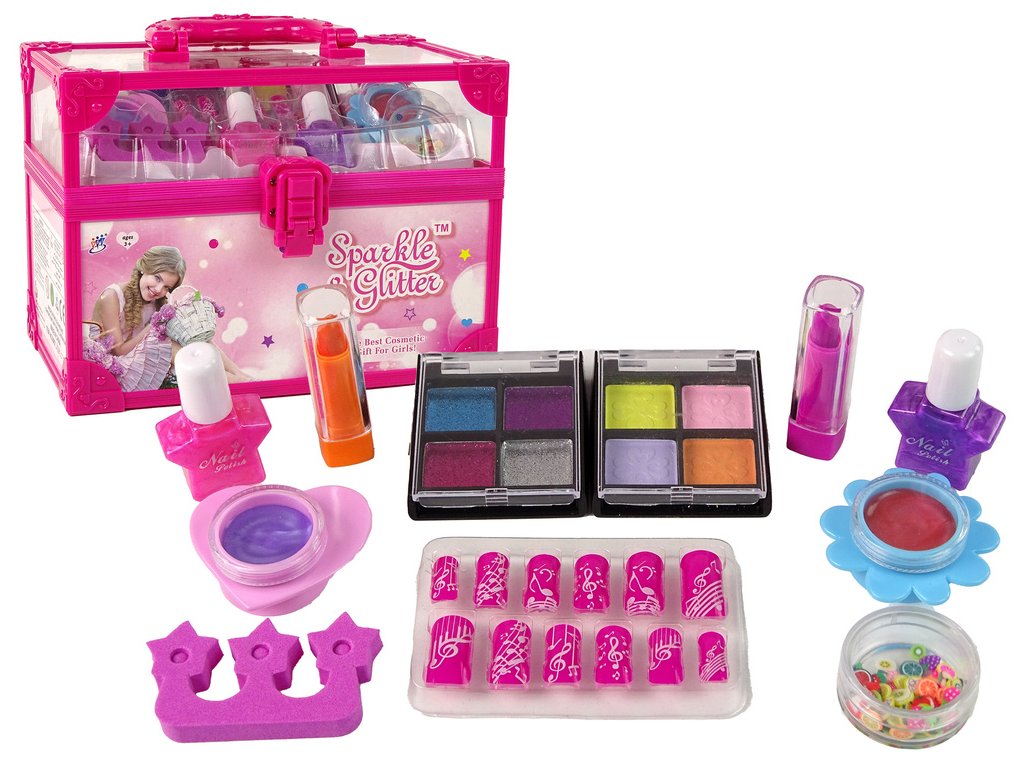 Sada obsahuje palety očních stínů, rtěnky, lesky na rty, laky na nehty a další příslušenství pro líčení a styling nehtů.