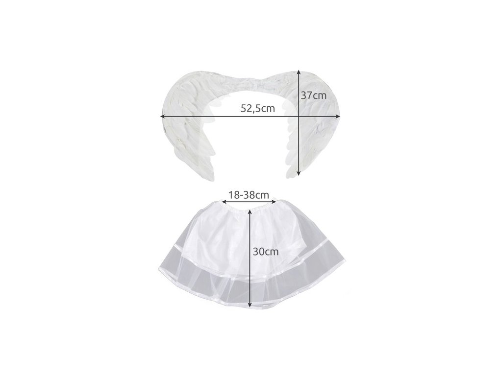 - Kostým anděla se skládá z dvouvrstvé sukně s gumičkou a bílými křídly připomínajícími andělská křídla.