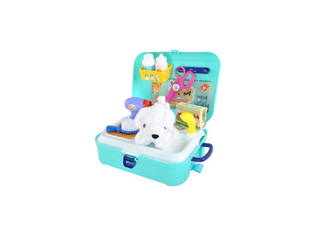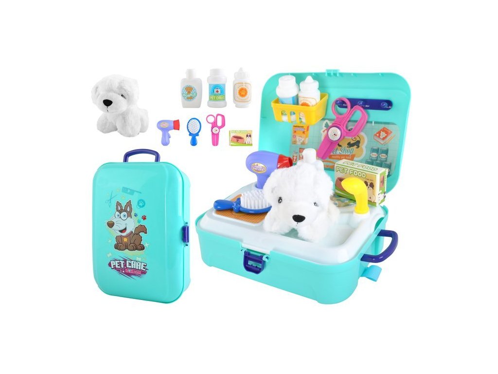 Sada psího salónuv kufru je skvělou hračkou pro každého malého psího nadšence. Sada obsahuje příslušenství , které vám umožní stříhat drápky, kartáčovat, koupat, sušit a krmit zvířátko. Celé je to uzavřeno v malém praktickém kufříku s úložným boxem, do kterého po skončení zábavy můžeme naaranžovat doplňky. Má nastavitelné záda, pohodlnou rukojeť a sponu, díky které vám hračky z kufru nevypadnou.
