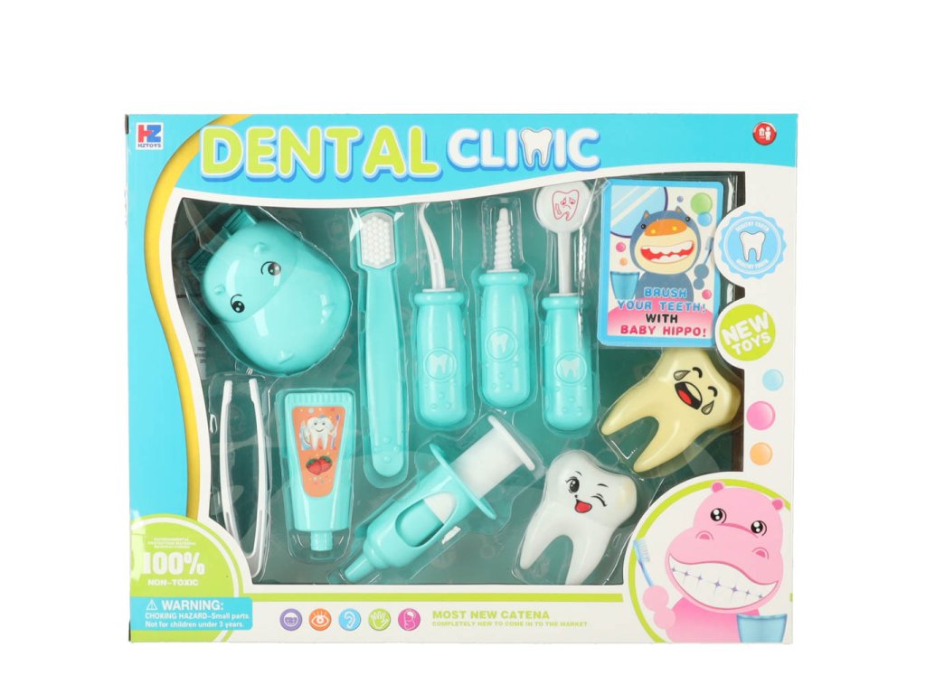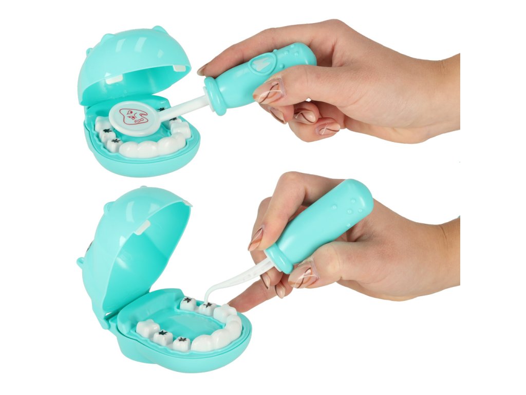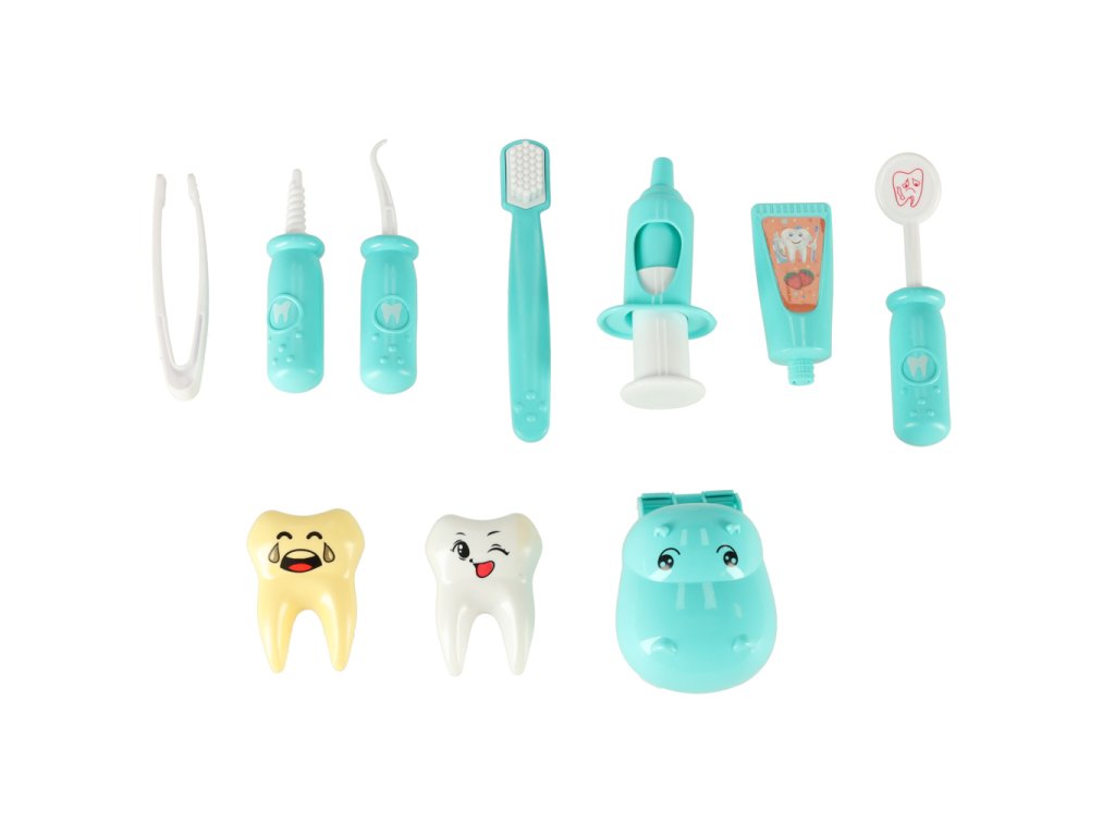 Hračka pro malého zubaře umožňuje dětem vžít se do role skutečného zubaře! Malý hroch má problémy s prořezáváním zoubků a potřebuje pomoc. Malí zubaři ho mohou ošetřit pomocí specializovaného příslušenství. Sada obsahuje zubní frézu, odstraňovač zubního kamene, stříkačku, pinzetu, zubní zrcátko, zubní kartáček a pastu – vše potřebné k provádění „procedur“.