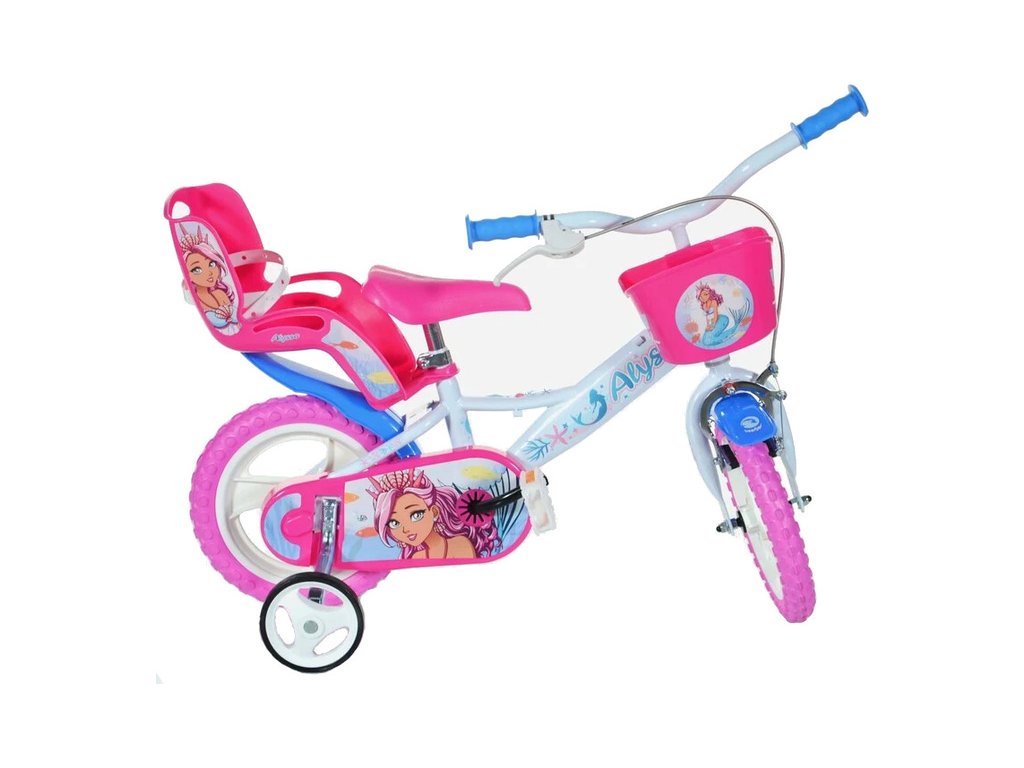 Dětské kolo DINO Bikes - 12" Als Alyssa se sedačkou pro panenku a košíkem pro malé cyklistky. Ráfek s plnou pneumatikou. Stálý převod, přední čelisťová brzda, přídavná kolečka, nastavitelné sedátko, gumové rukojeti. Doporučený věk a výška dítěte: 2-4 roky, 87-120 cm.