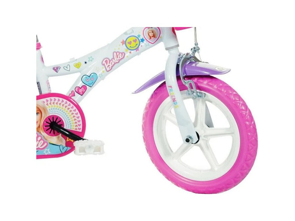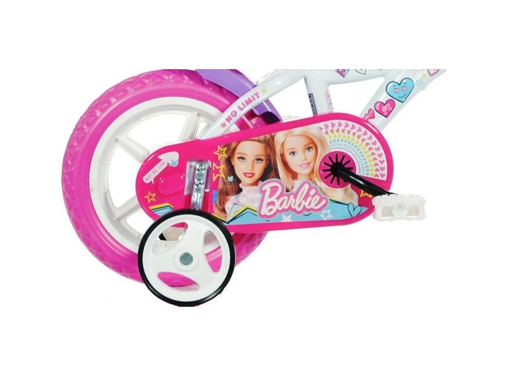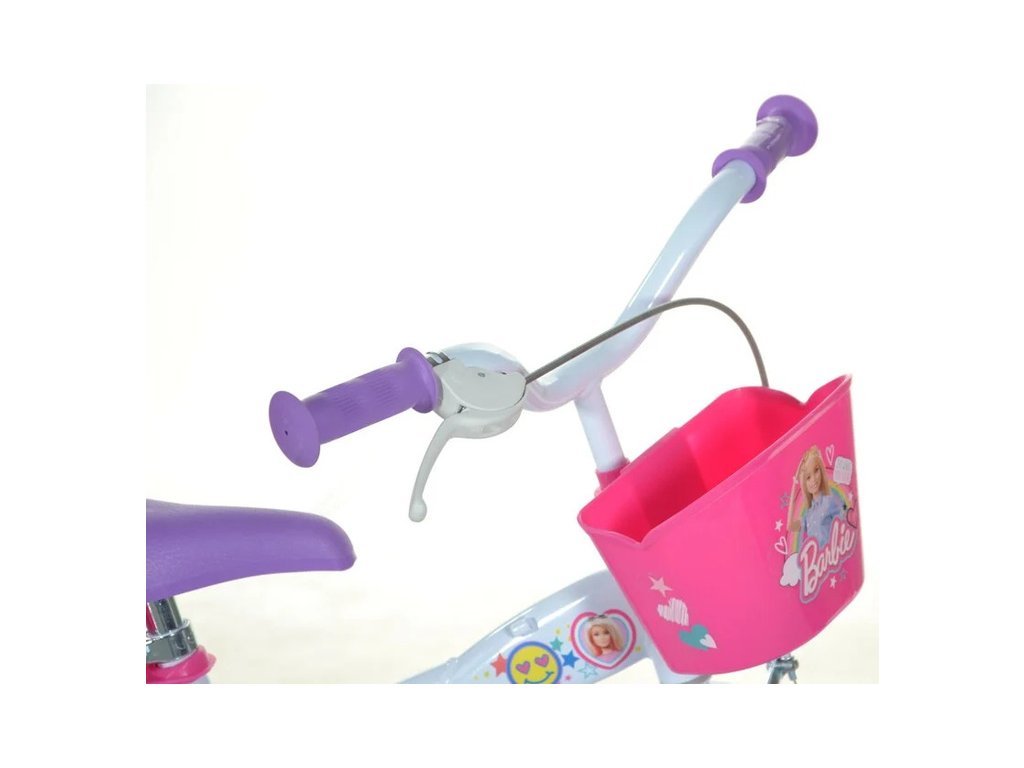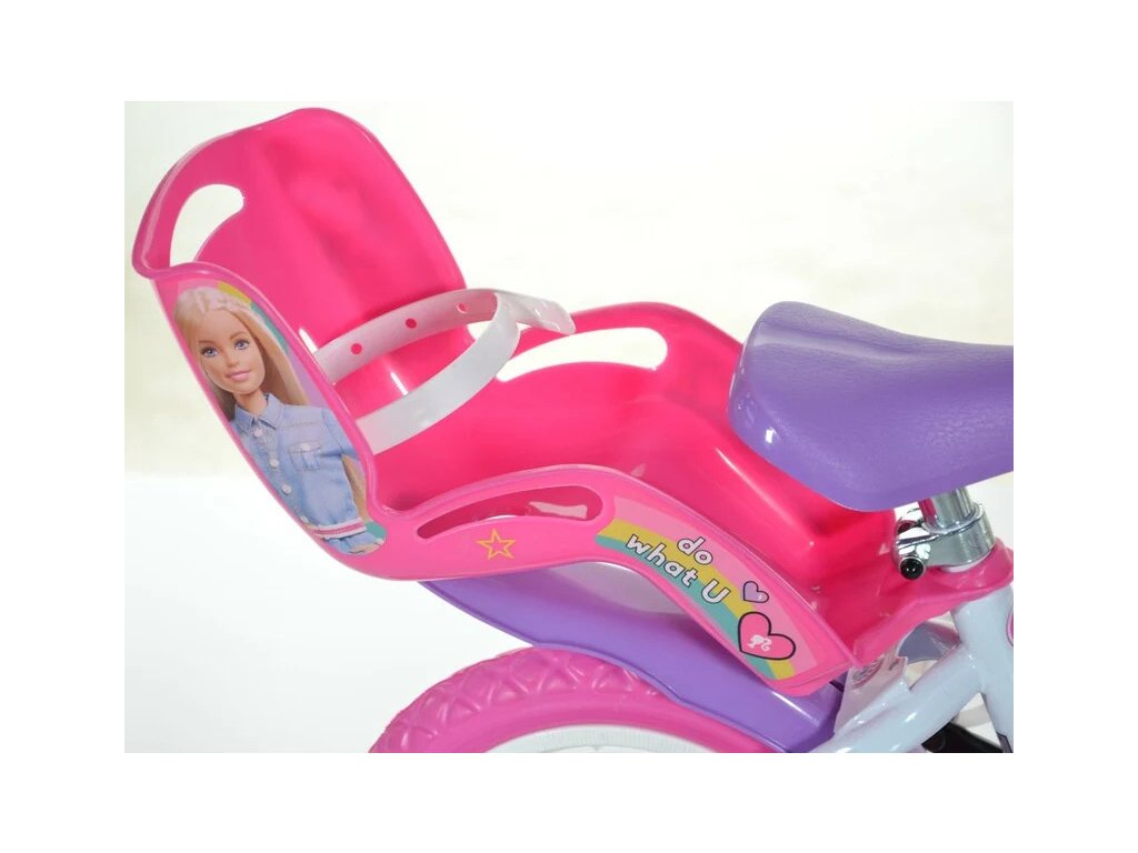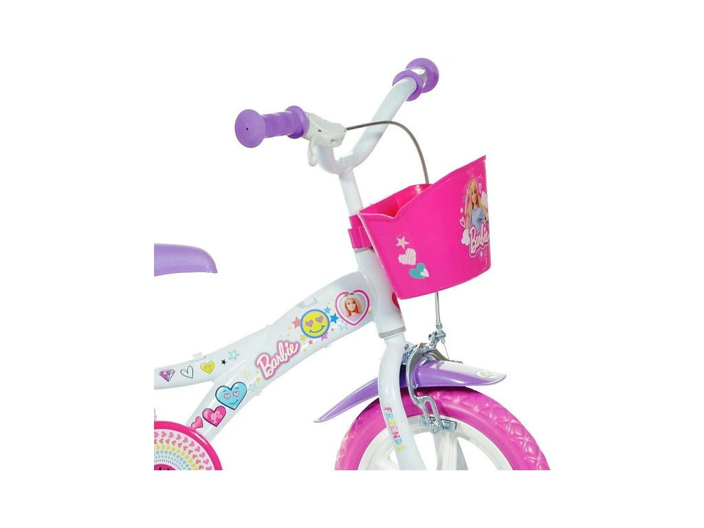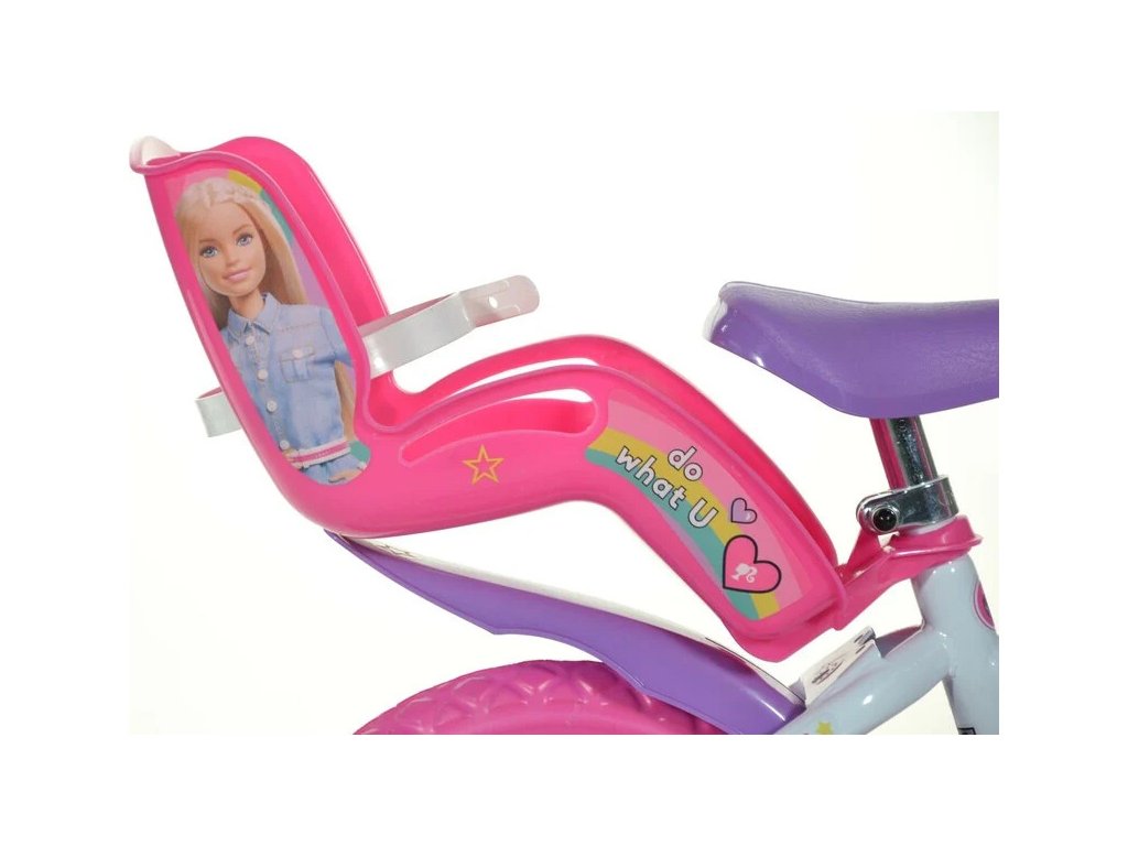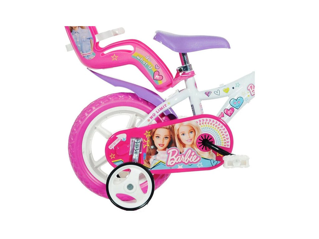 Dětské kolo DINO Bikes - 12" s úžasným motivem Barbie, se sedačkou pro panenku a košíkem pro malé cyklistky. Ráfek s plnou pneumatikou. Stálý převod, přední čelisťová brzda, přídavná kolečka, nastavitelné sedátko, gumové rukojeti. Doporučený věk a výška dítěte: 2-4 roky, 87-120 cm.