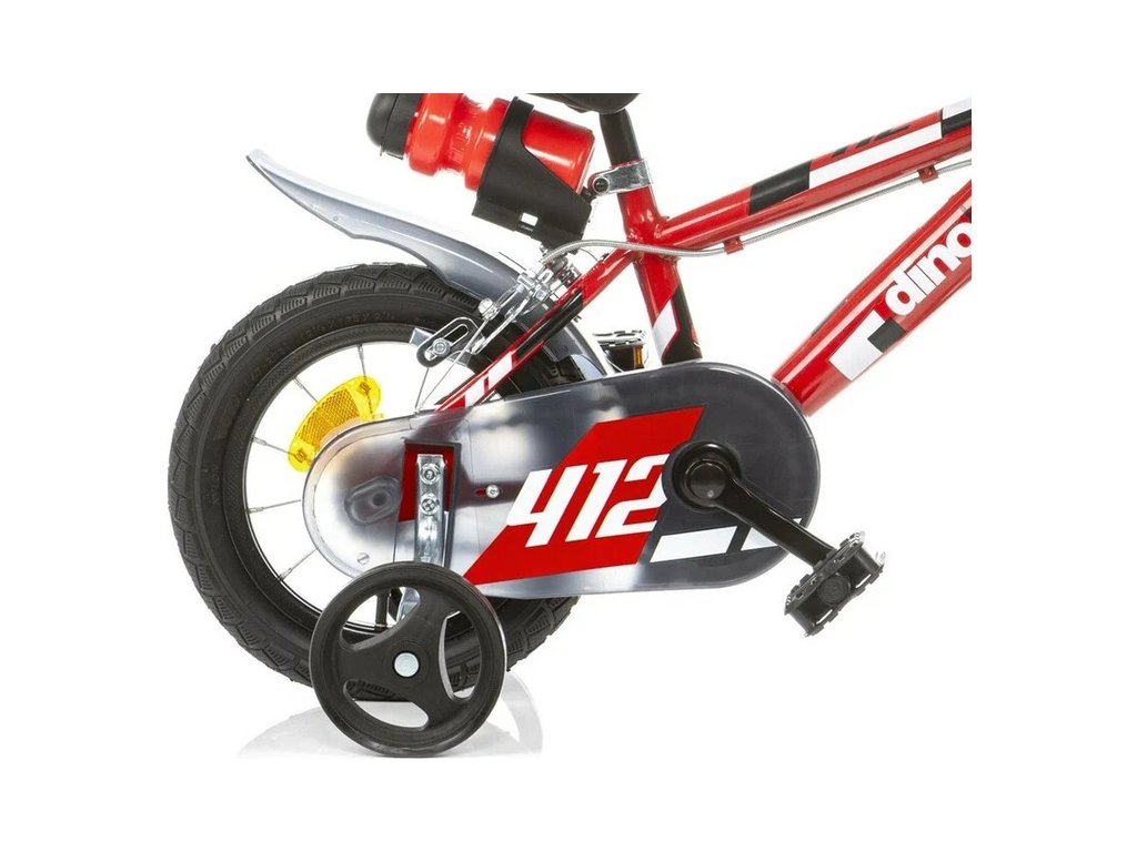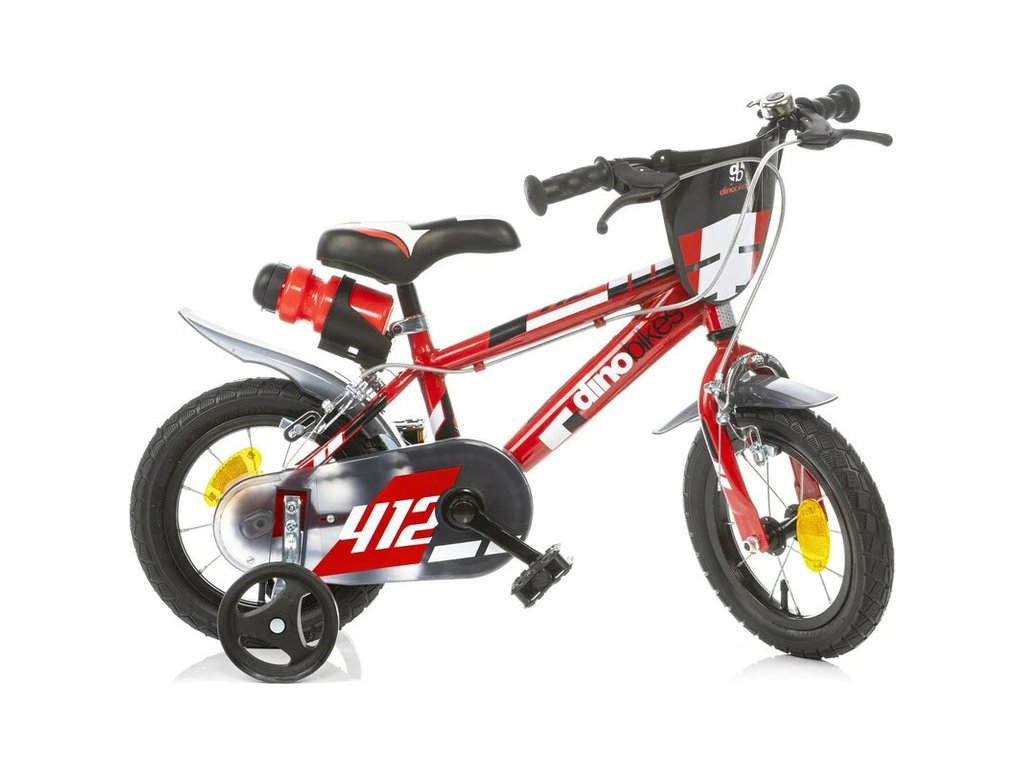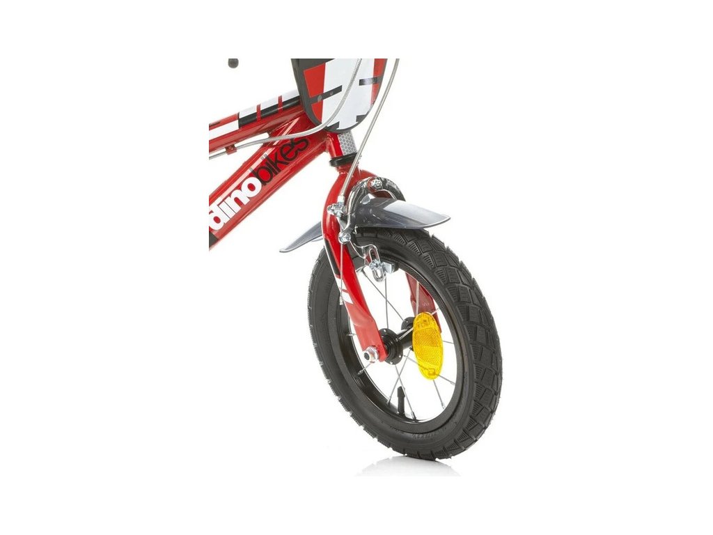 Dětské kolo DINO Bikes - 12" červené. Vzduchem plněné pneumatiky s drátovým výpletem ráfků, volnoběžný převod, čelisťové brzdy na obě kola, držák na lahev, zvonek. Doporučený věk a výška dítěte: 2-4 roky, 87-120 cm.
