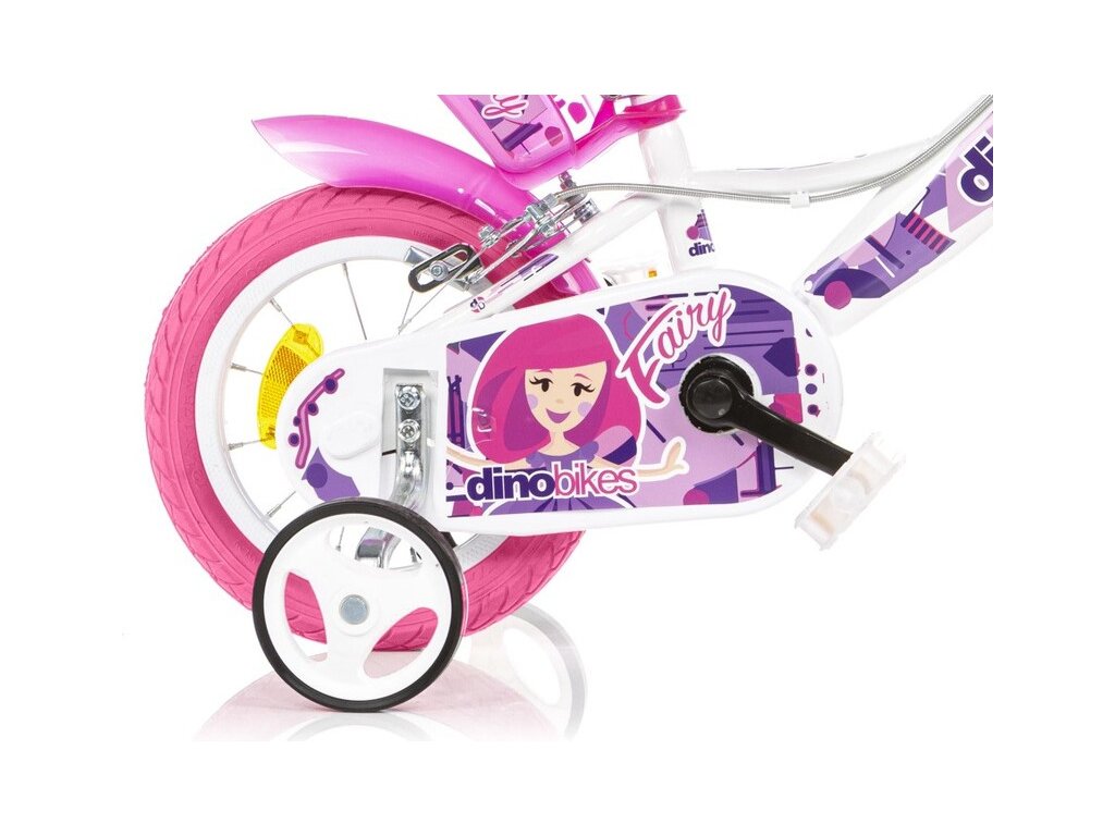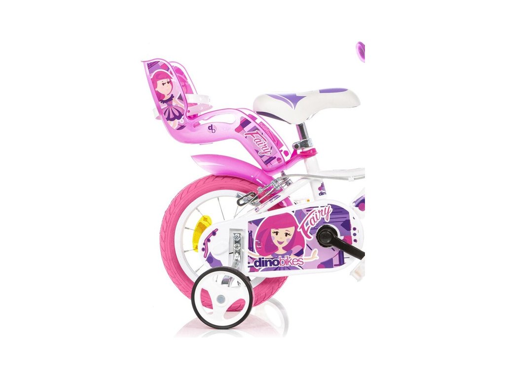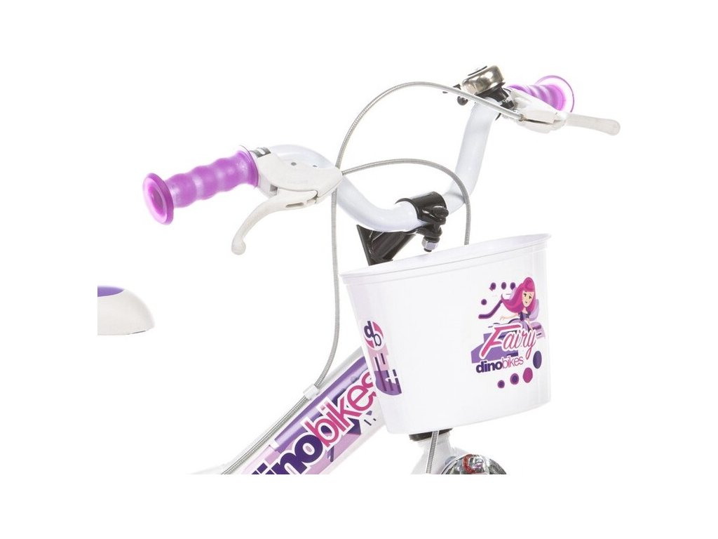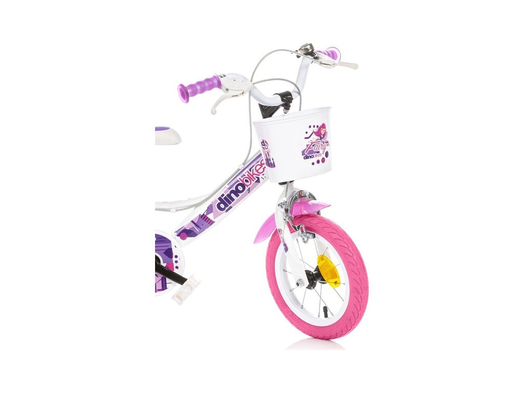Dětské kolo DINO Bikes - 12" s motivem Fairy bílé, sedačkou pro panenku a košíkem, je perfektní kolo pro malé cyklistky. Vzduchem plněné pneumatiky s kovovými ráfky, přídavná kolečka, volnoběžný převod, čelisťové brzdy na obě kola. Zvonek.
