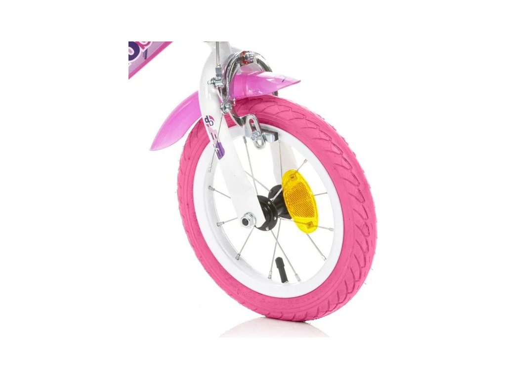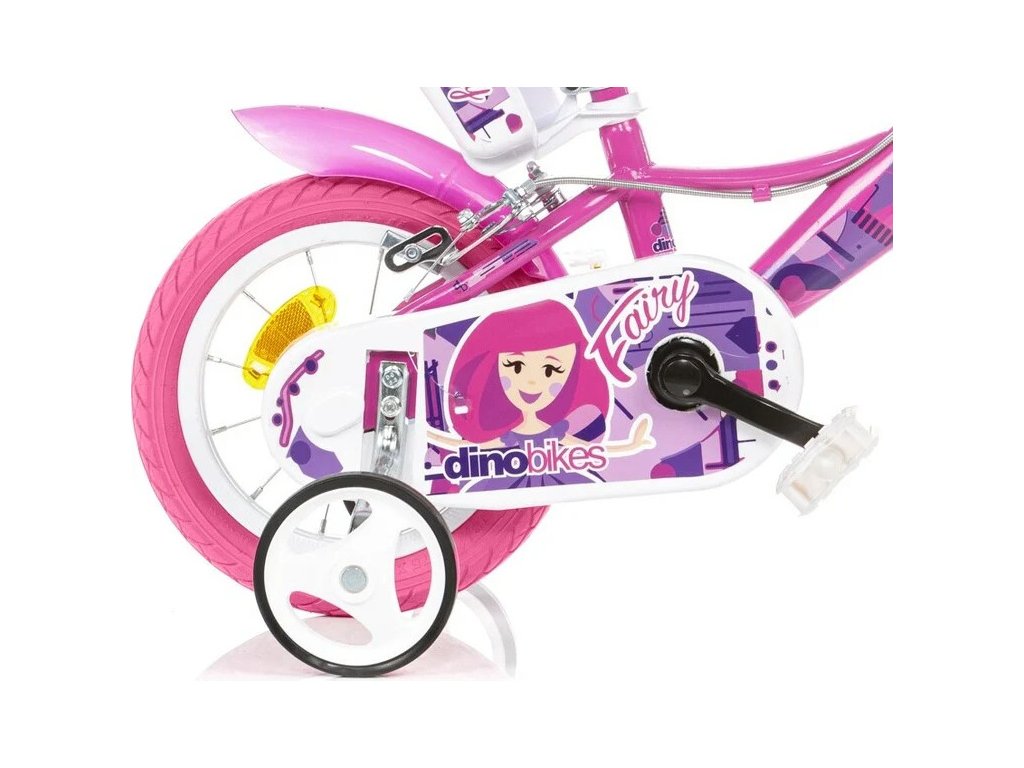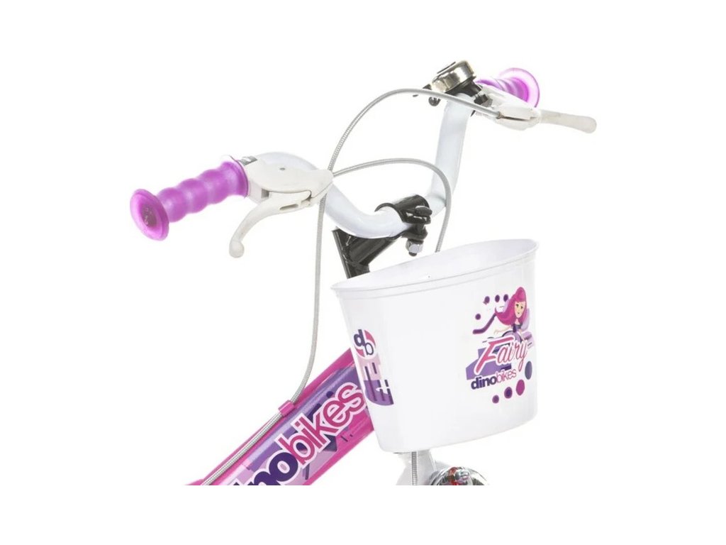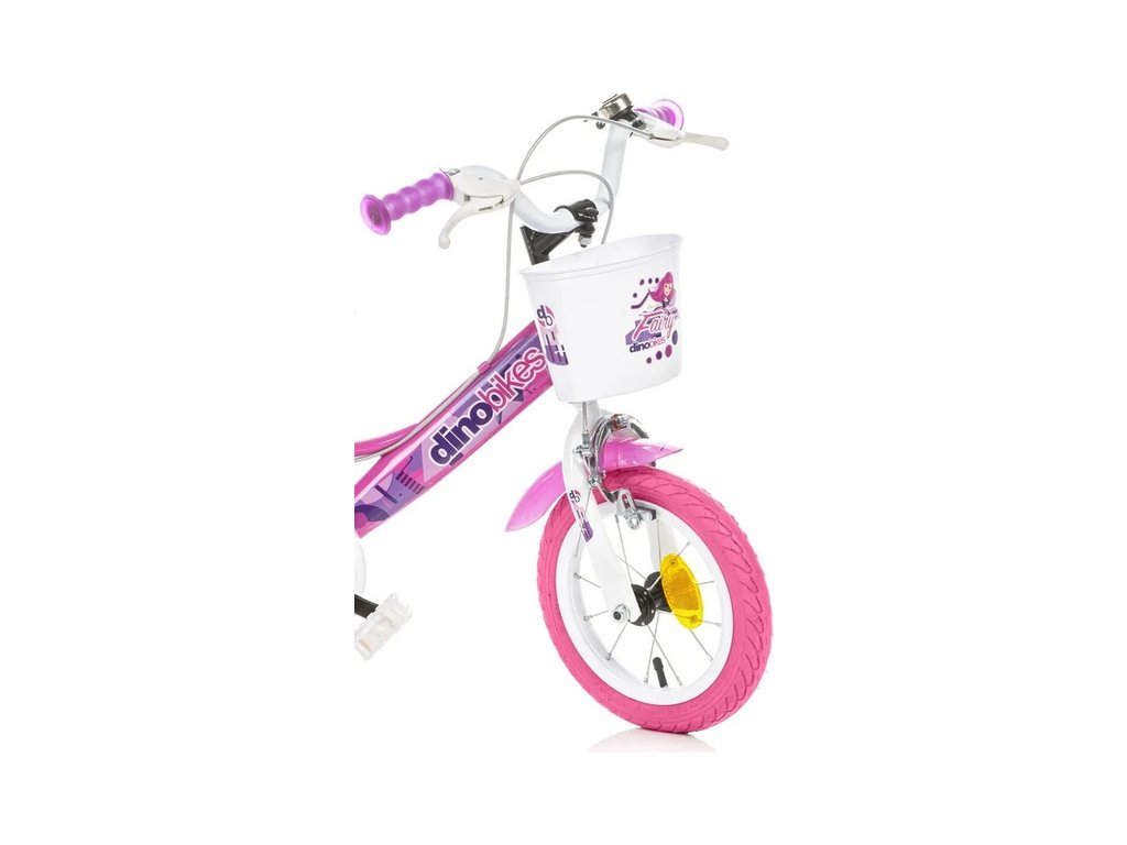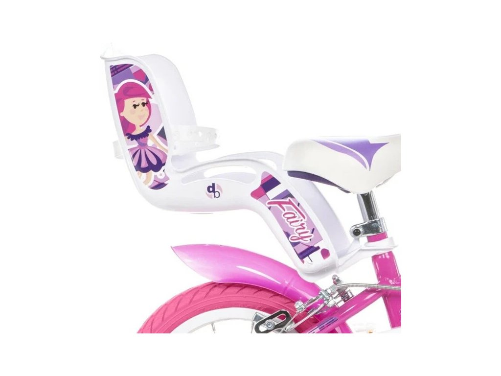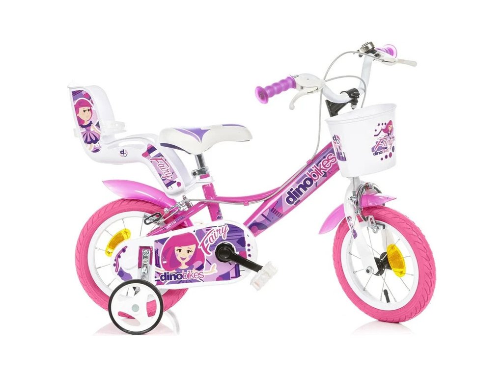 Dětské kolo DINO Bikes - 12" s motivem Fairy růžové, sedačkou pro panenku a košíkem, je perfektní kolo pro malé cyklistky. Vzduchem plněné pneumatiky s kovovými ráfky, přídavná kolečka, volnoběžný převod, čelisťové brzdy na obě kola.