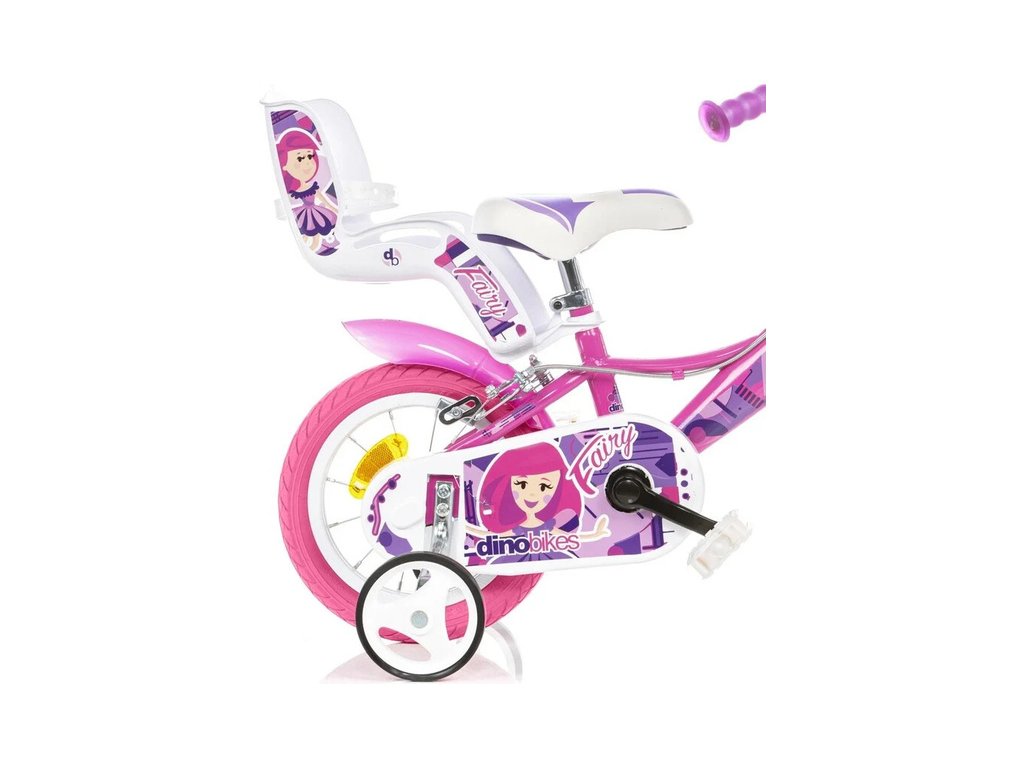 Dětské kolo DINO Bikes - 12" s motivem Fairy růžové, sedačkou pro panenku a košíkem, je perfektní kolo pro malé cyklistky. Vzduchem plněné pneumatiky s kovovými ráfky, přídavná kolečka, volnoběžný převod, čelisťové brzdy na obě kola. Zvonek. Doporučený věk a výška dítěte: 2-4 roky, 87-120 cm.