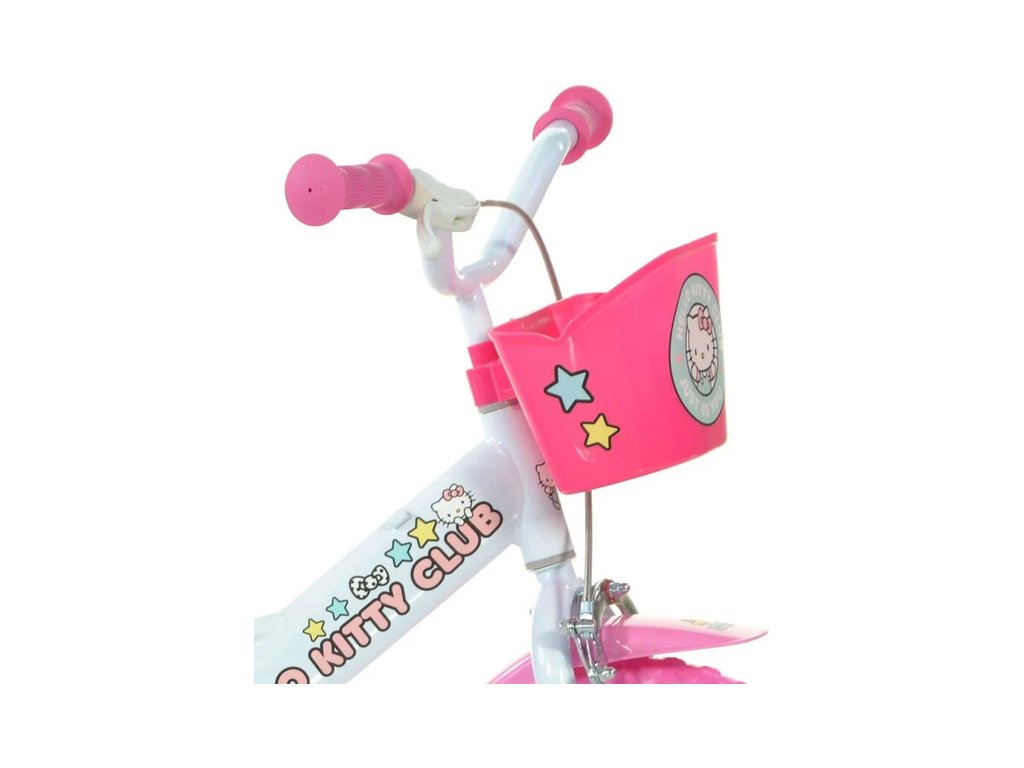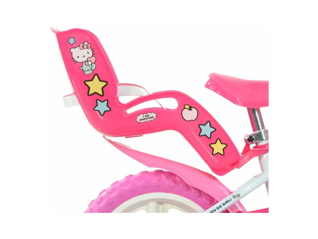 Dětské kolo DINO Bikes - 12" Hello Kitty 2 se sedačkou pro panenku a košíkem pro malé cyklistky. Ráfek s plnou pneumatikou. Stálý převod, přední čelisťová brzda, přídavná kolečka, nastavitelné sedátko, gumové rukojeti. Doporučený věk a výška dítěte: 2-4 roky, 87-120 cm.