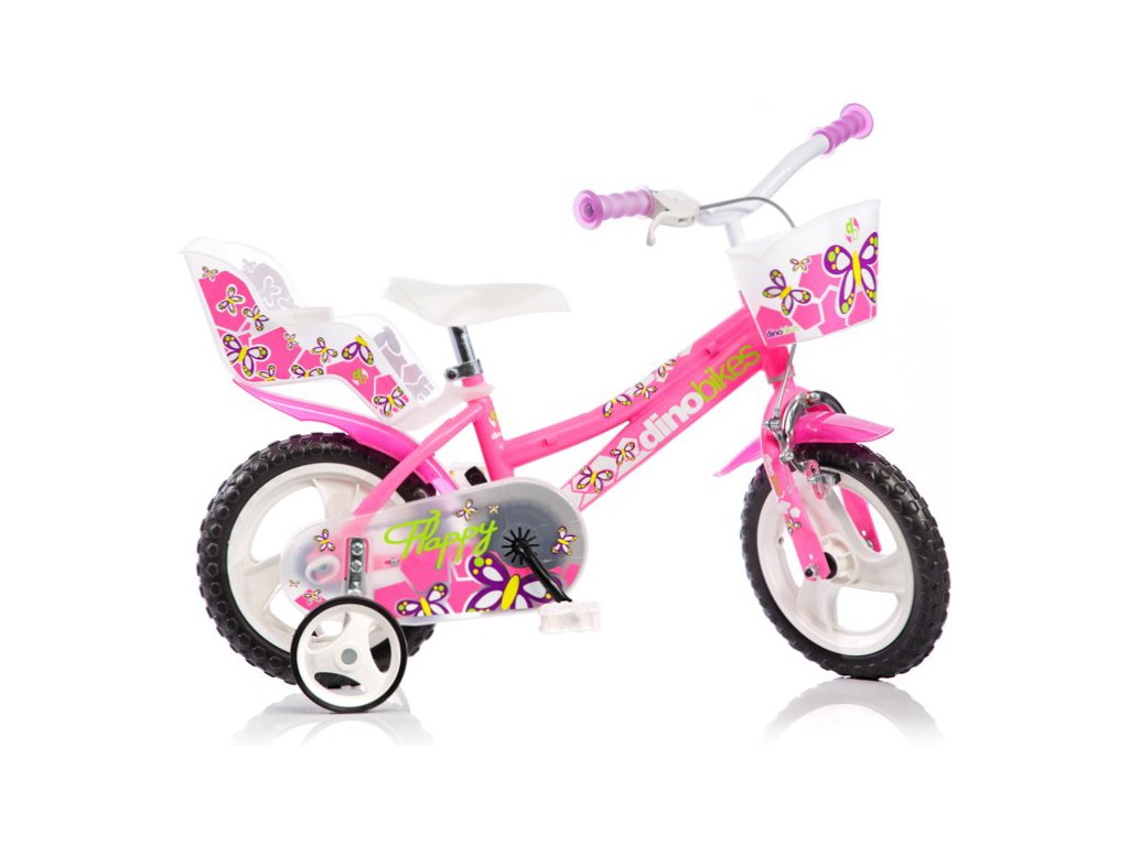 Dětské kolo Dino Bikes - 12" růžové se sedačkou pro panenku a košíkem, pro malé cyklisty. Ráfek s plnou pneumatikou. Stálý převod, přední čelisťová brzda, je vybaveno pomocnými kolečky a košíkem na řídítkách a kufříkem.