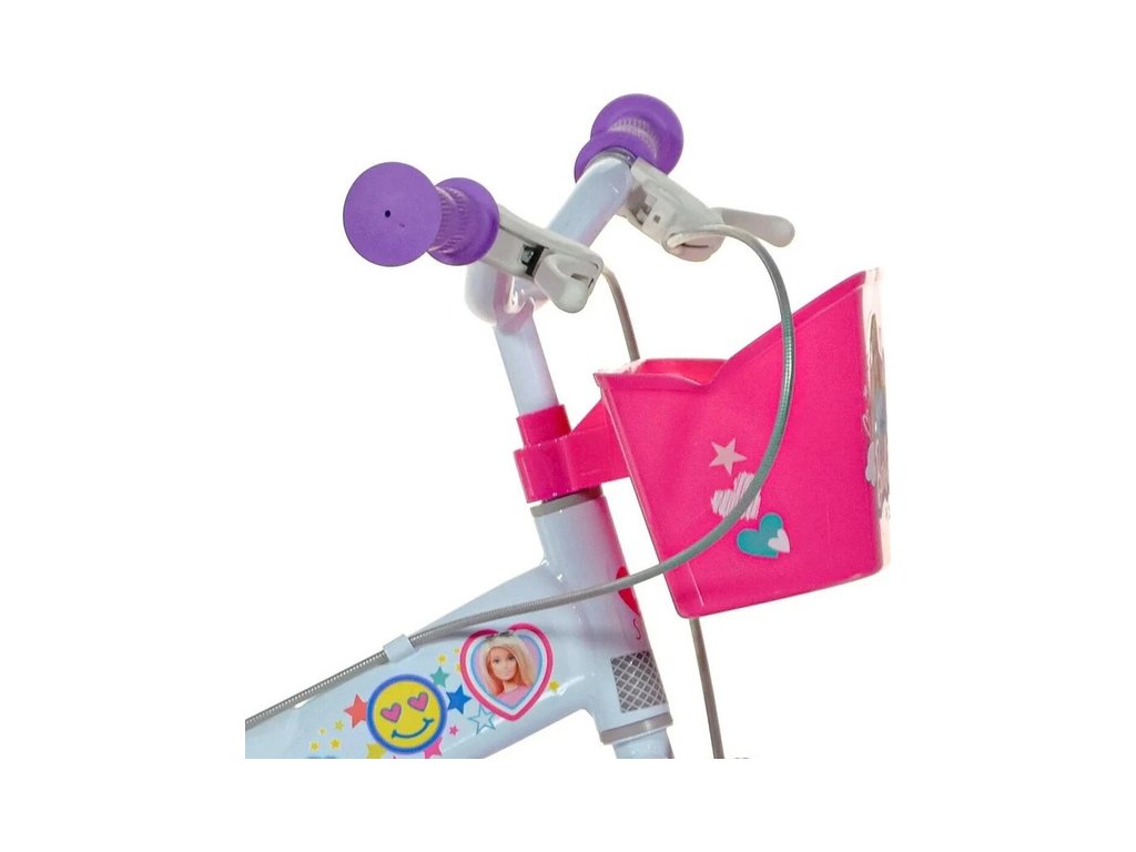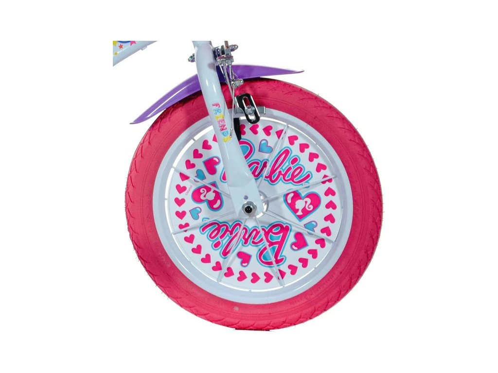 Dětské kolo DINO Bikes - 14" s úžasný motivem oblíbených panenek Barbie, sedačkou pro panenku a košíkem, je perfektní kolo pro malé cyklistky. Vzduchem plněné pneumatiky s kovovými ráfky, přídavná kolečka, volnoběžný převod, čelisťové brzdy na obě kola. Doporučený věk a výška dítěte: 3-5 let, 95-127 cm.