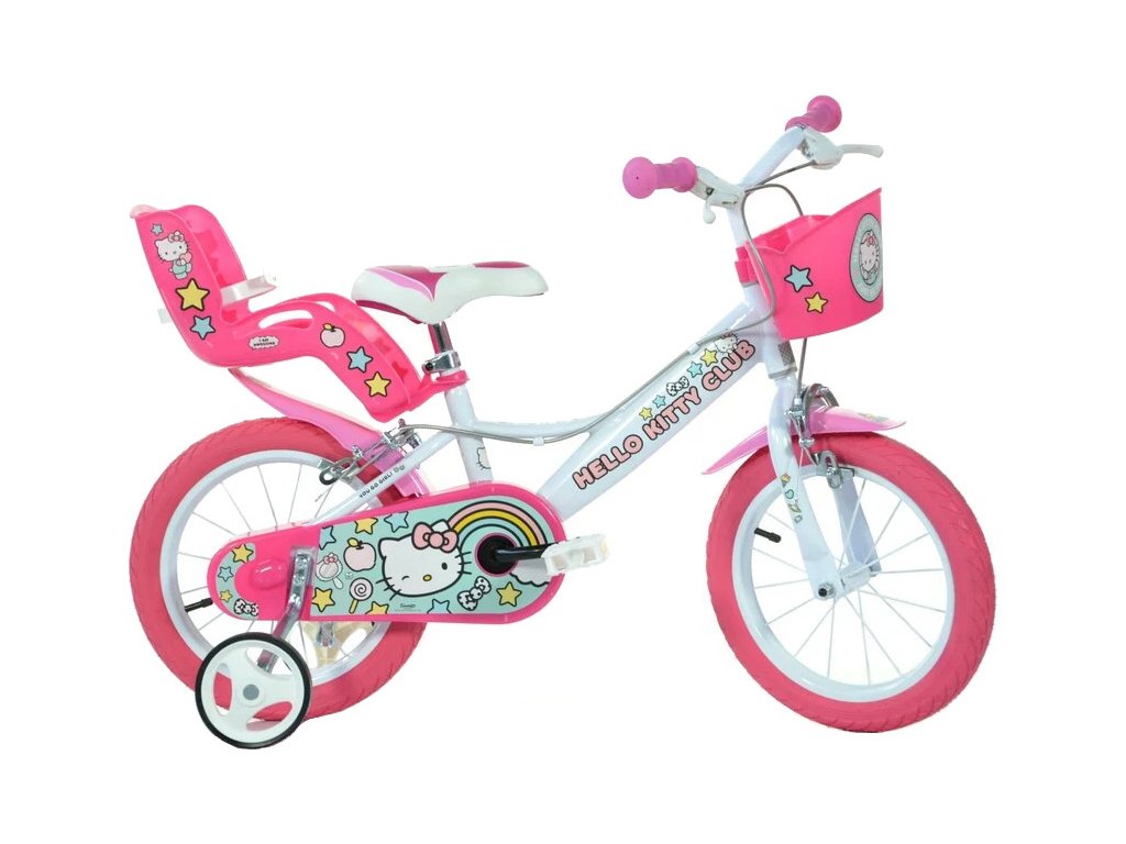Dětské kolo DINO Bikes - 14" s motivem Hello Kitty 2, sedačkou pro panenku a košíkem, je perfektní kolo pro malé cyklistky. Vzduchem plněné pneumatiky s kovovými ráfky, přídavná kolečka, volnoběžný převod, čelisťové brzdy na obě kola.