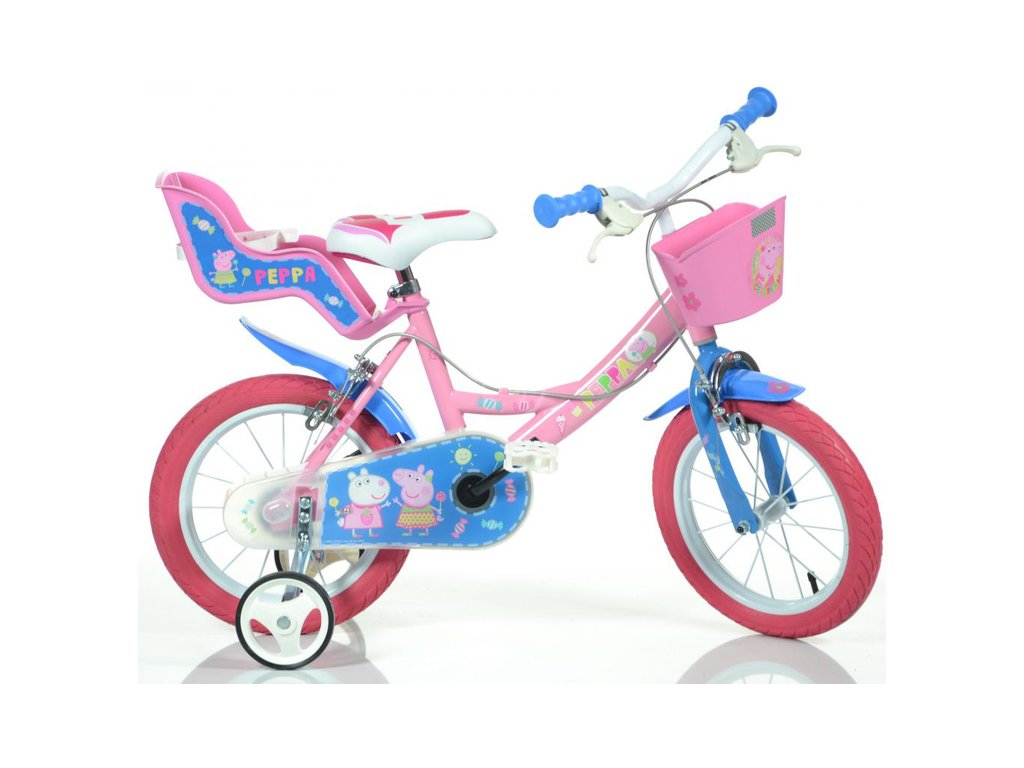 Dětské kolo DINO Bikes - Dětské kolo 14" Pepa Pig se sedačkou a košíkem pro malé cyklisty s nastavitelným sedadlem a řídítky se zadním košem a předním štítem. Kvalitní, vzduchem plněné pneumatiky, volnoběžný převod a čelisťové brzdy na obou kolech, odnímatelné stabilizační kolečka.