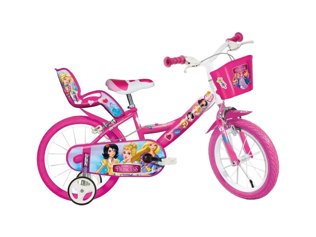 Dětské kolo DINO Bikes - 14" pro malé princezny od Italského výrobce, se sedačkou pro panenku a košíkem na věci. Licencovaný dětský motiv Princess. Vzduchem plněné pneumatiky s kovovými ráfky, přídavná kolečka, volnoběžný převod, čelisťové brzdy na obě kola.