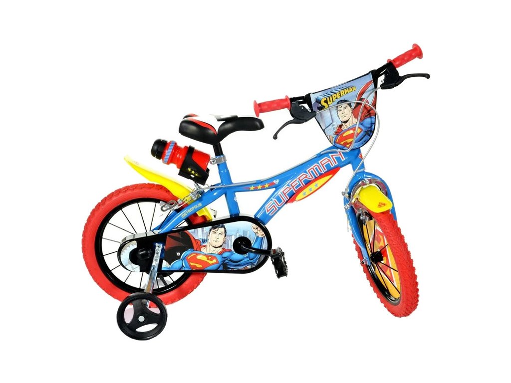 Dětské kolo DINO Bikes - 14" s motivem superhrdiny Supermana. Kolo má vzduchem plněné pneumatiky s drátovým výpletem ráfků, volnoběžný převod, čelisťové brzdy na obě kola, držák na lahev.