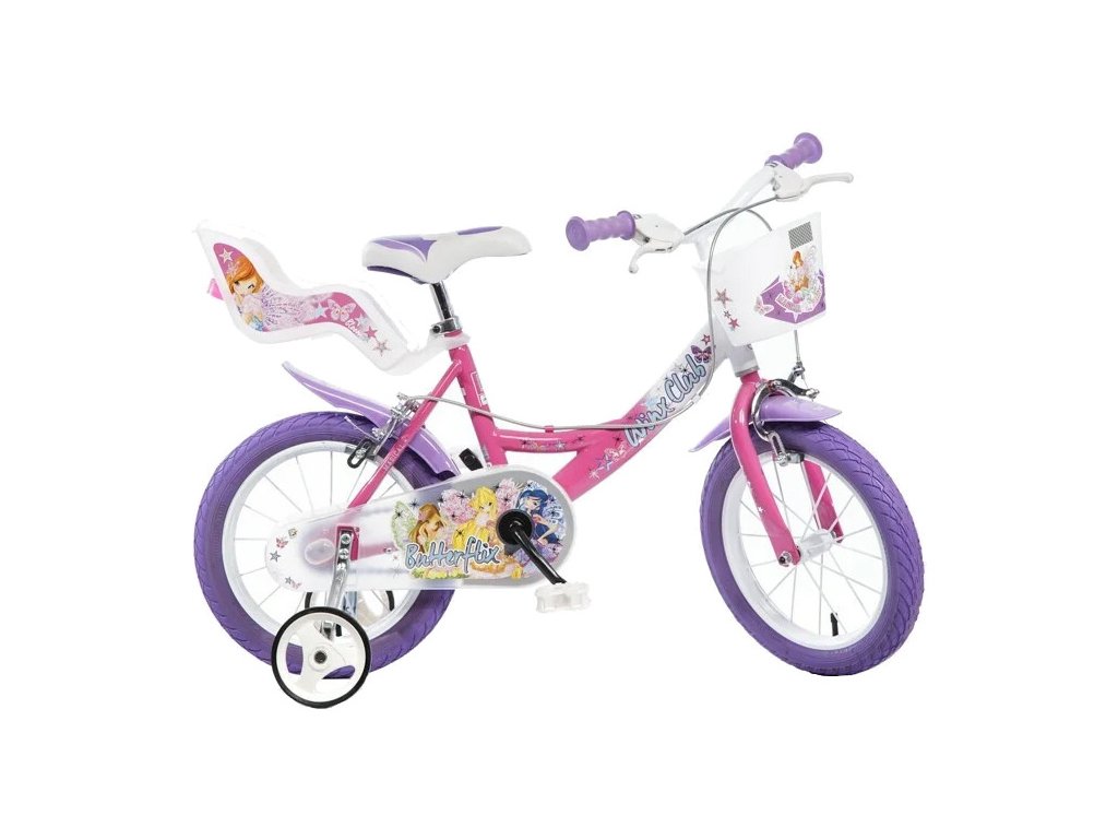 Dětské kolo DINO Bikes - 14" od Italského výrobce, s licencovaným motivem Winx, sedačkou pro panenku a košíkem na věci. Vzduchem plněné pneumatiky s kovovými ráfky, přídavná kolečka, volnoběžný převod, čelisťové brzdy na obě kola.