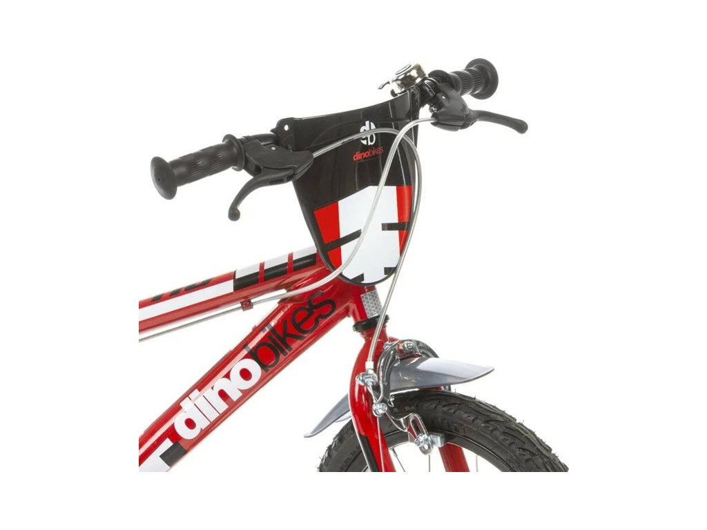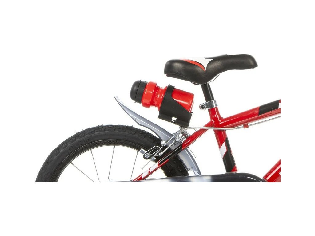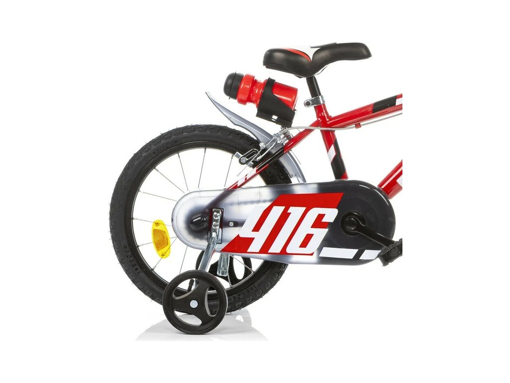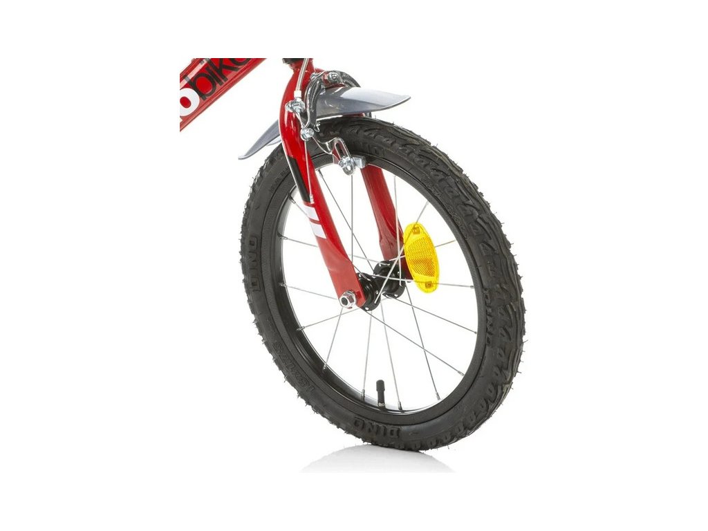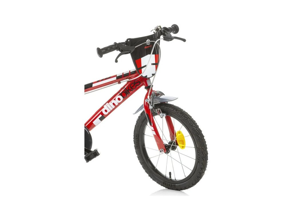Dětské kolo DINO Bikes 16" červené, od italského výrobce. Rám z Hi-ten oceli, přední a zadní čelisťová brzda, vzduchem plněné pneumatiky s drátovým výpletem ráfků, přídavná kolečka, držák na lahev. Zvonek. Doporučený věk a výška dítěte: 4-6 roků, 107-138 cm.