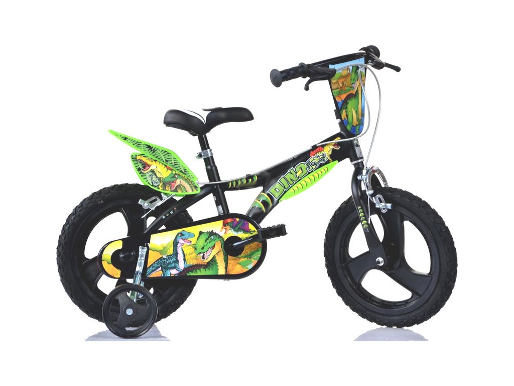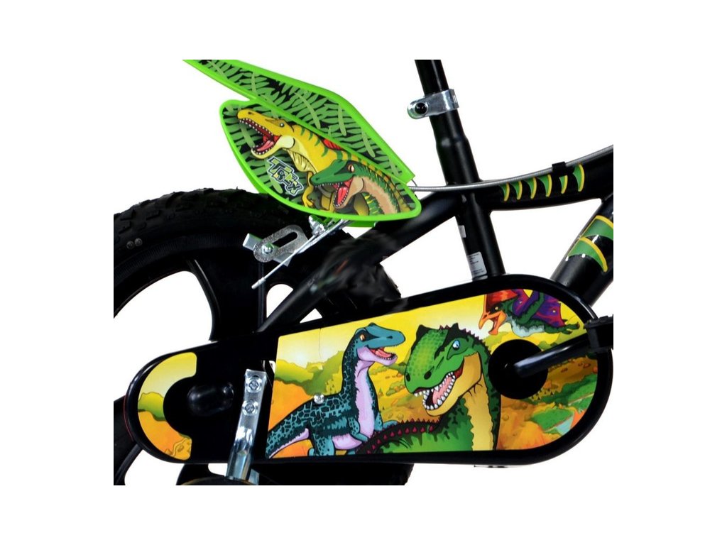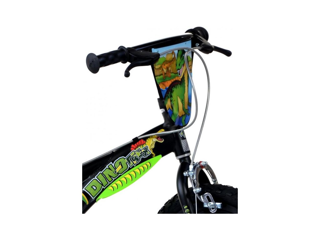 Dětské kolo 16" Dino T.Rex - DINO Bikes. Moderní kolo se stylovým designem dinosaurů. Italský výrobce. Čelisťové brzdy na obě kola, volnoběžný převod, plastové ráfky se vzduchovými pneumatikami, blatníky, pomocná kolečka. Doporučený věk a výška dítěte: 4-6 roky, 107-138 cm.
