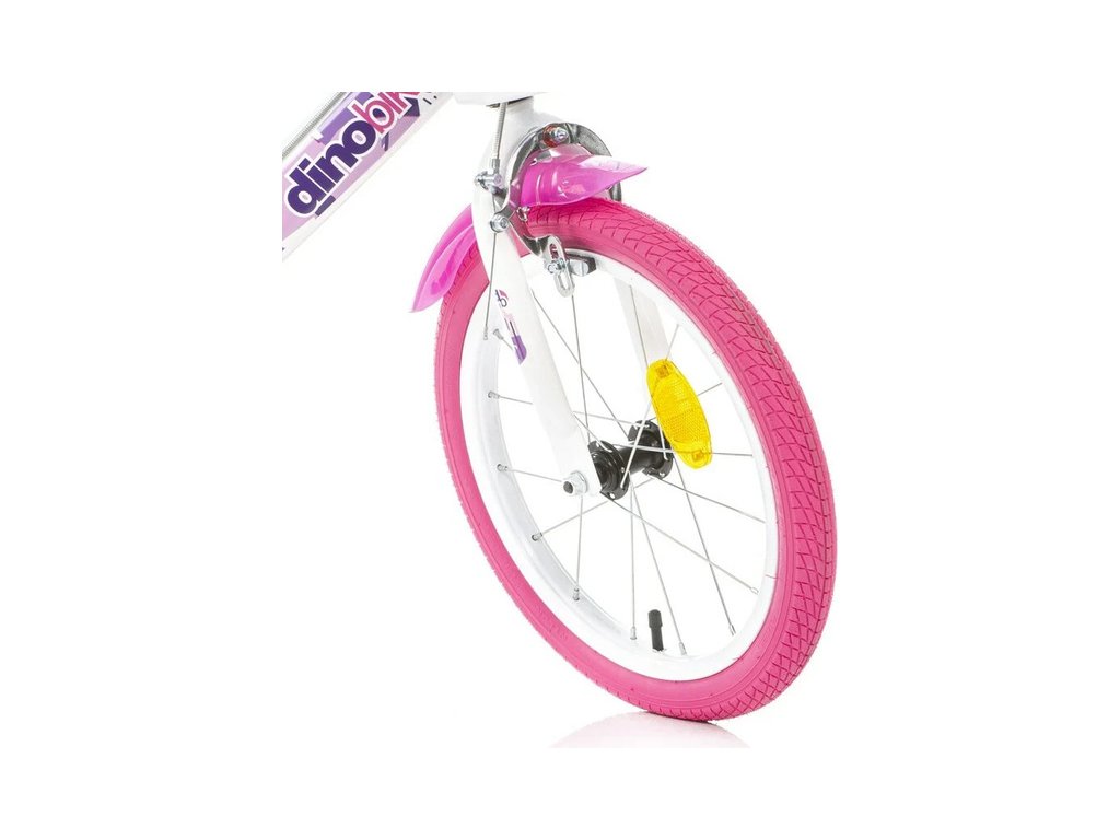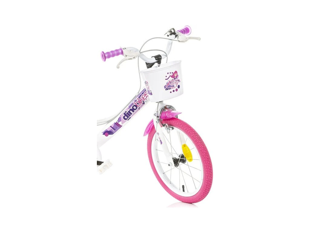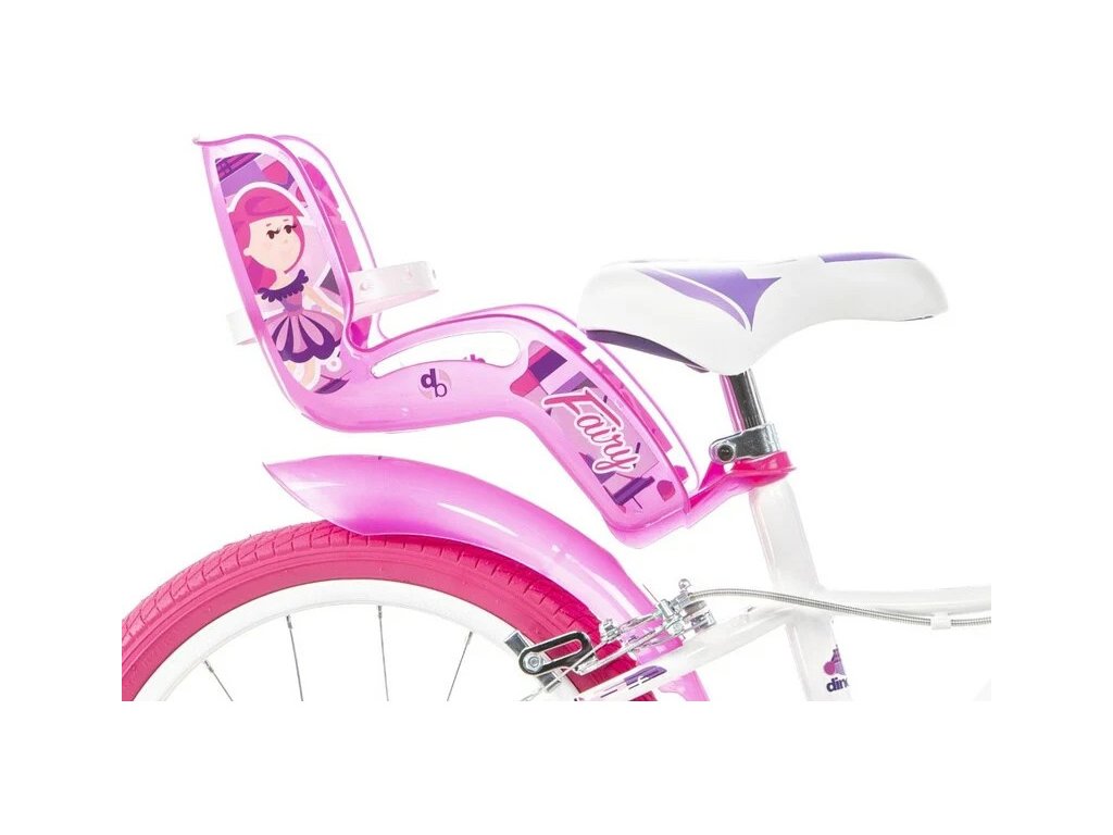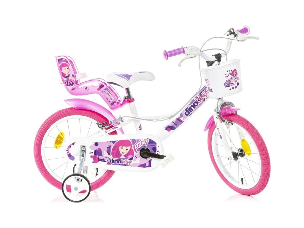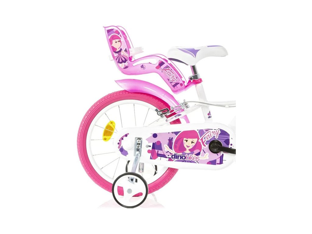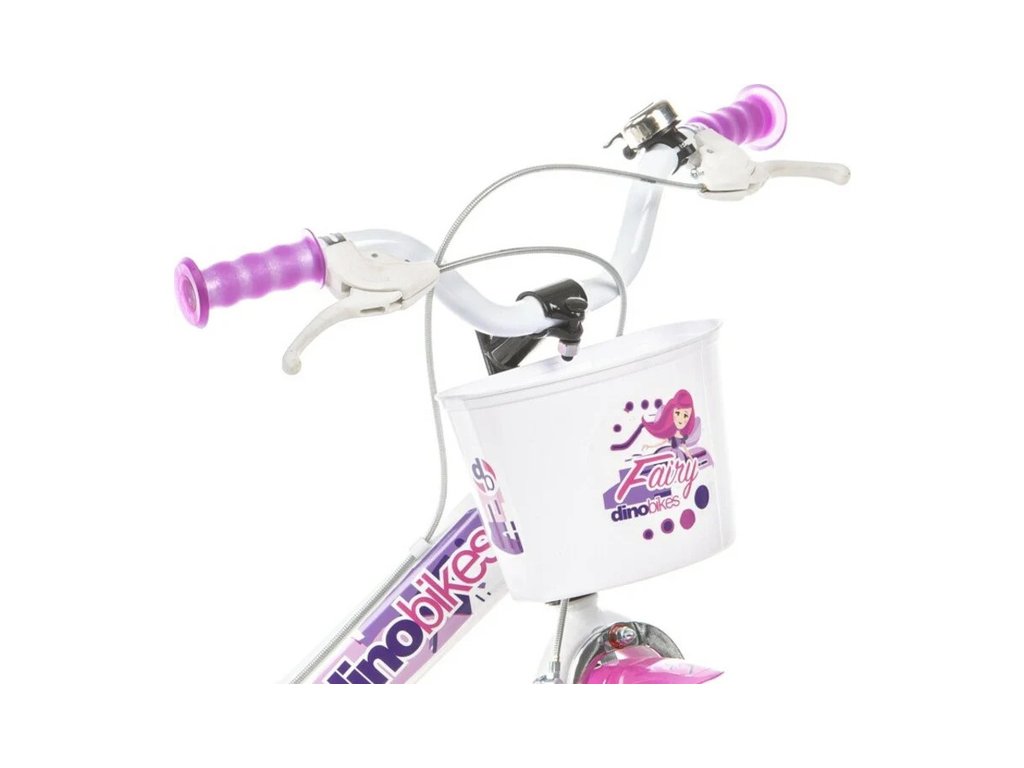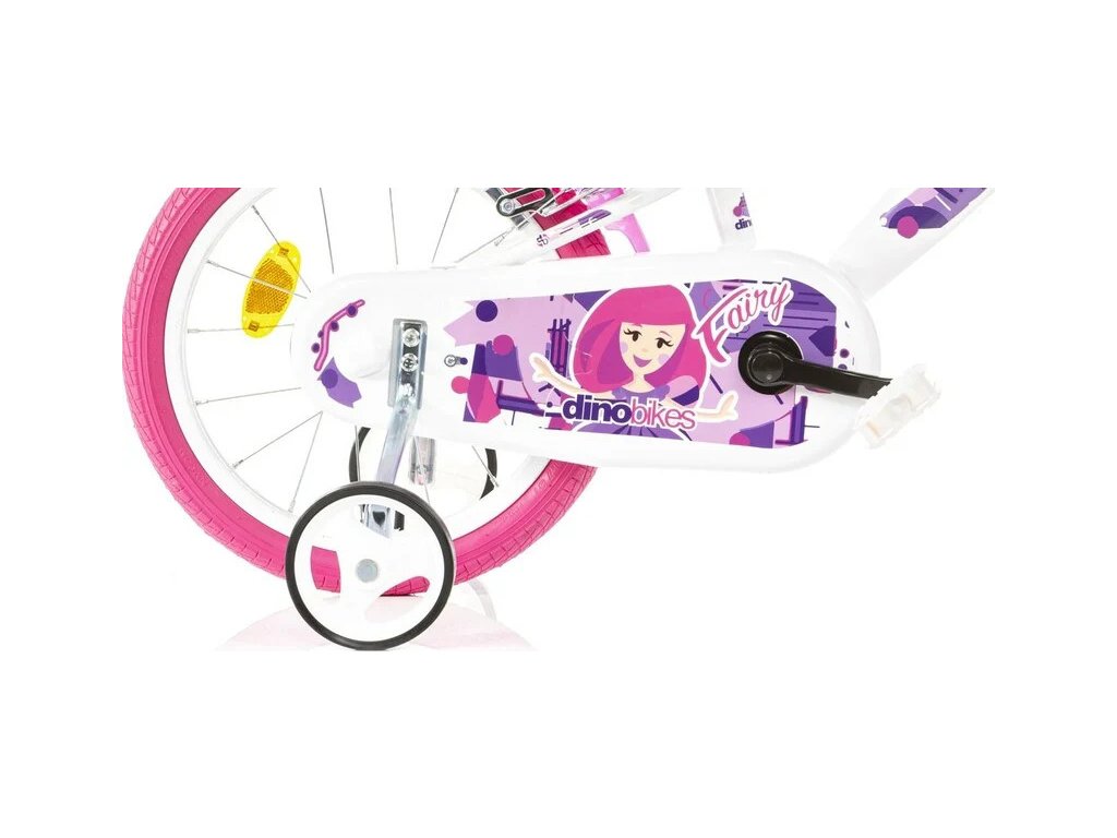 Dětské kolo DINO Bikes - 16" s motivem Fairy bílé, sedačkou pro panenku a košíkem. Vzduchem plněné pneumatiky s drátovým výpletem ráfků, volnoběžka, přední a zadní čelisťová brzda. Zvonek, přídavná kolečka, blatníky. Doporučený věk a výška dítěte: 4-6 roků, 107-138 cm.