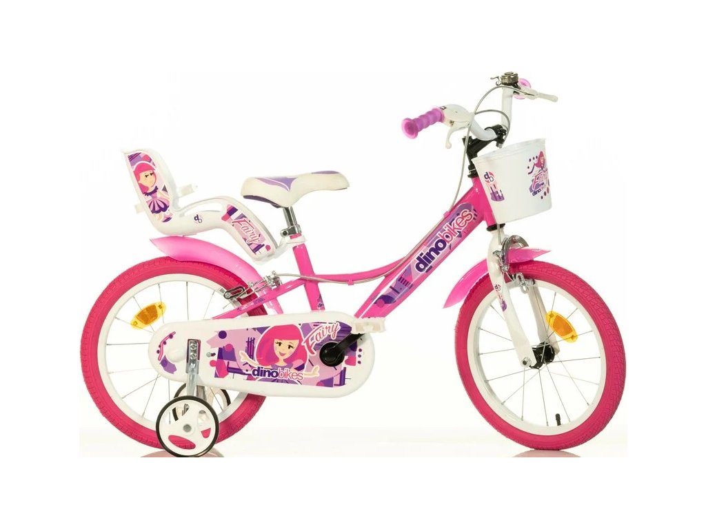 Dětské kolo DINO Bikes - 16" Fairy od Italského výrobce, se sedačkou pro panenku a košíkem. Vzduchem plněné pneumatiky s drátovým výpletem ráfků, volnoběžka, přední a zadní čelisťová brzda. Doporučený věk a výška dítěte: 4-6 roků, 107-138 cm.