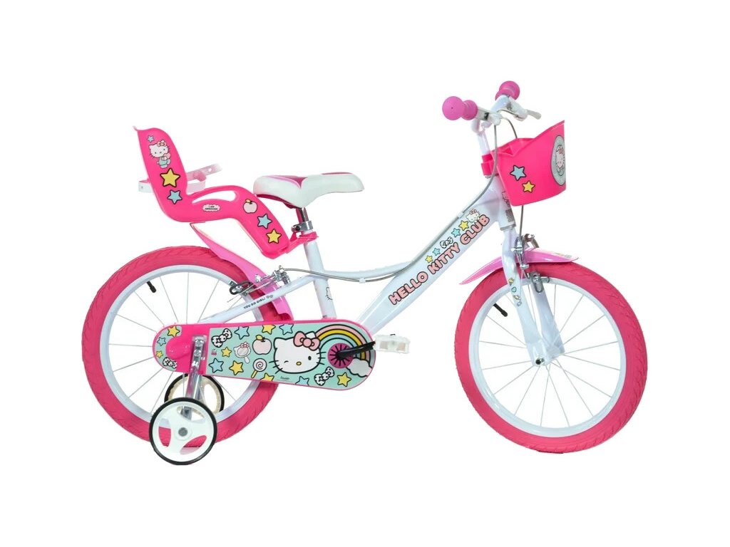 Dětské kolo DINO Bikes - 16" Hello Kitty 2 od Italského výrobce, se sedačkou pro panenku a košíkem. Vzduchem plněné pneumatiky s drátovým výpletem ráfků, volnoběžka, přední a zadní čelisťová brzda.