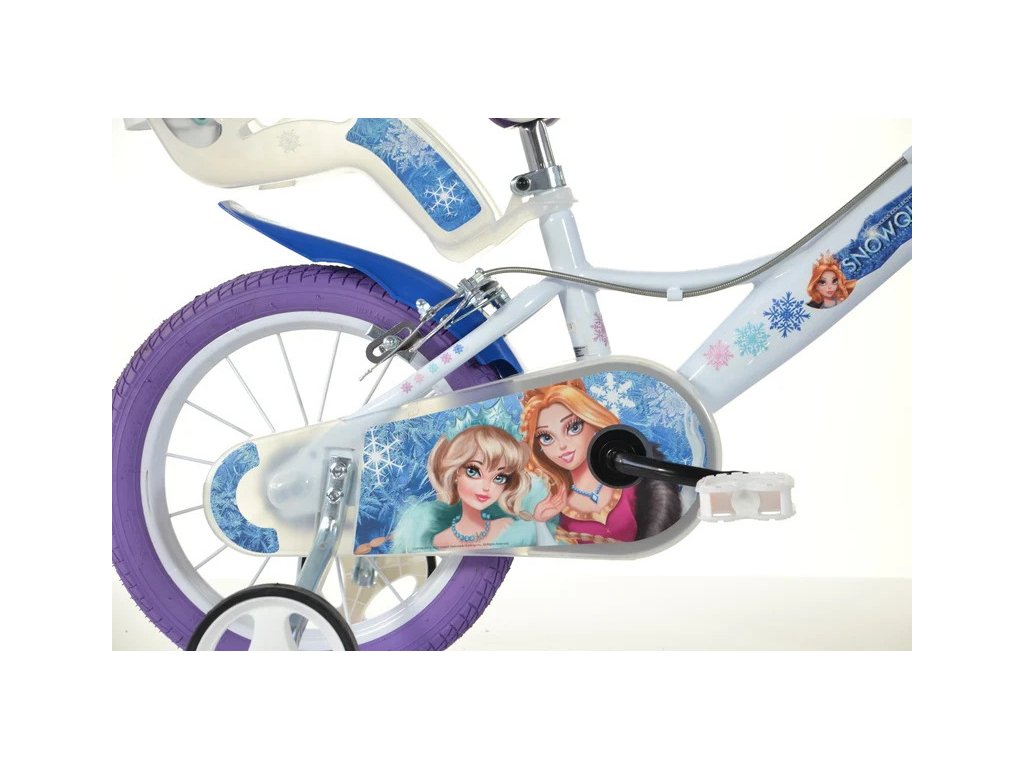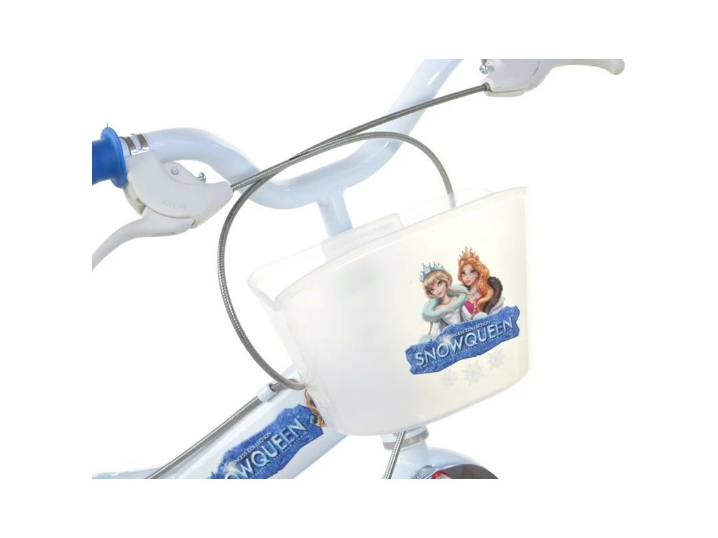 Dětské kolo DINO Bikes - 16" Snow Queen se sedačkou pro panenku a košíkem. Kvalitní, vzduchem plněné pneumatiky s drátovým výpletem ráfků, volnoběžka, přídavná balanční kolečka, přední a zadní čelisťová brzda.