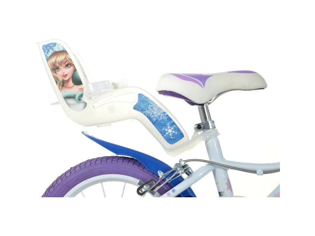 Dětské kolo DINO Bikes - 16" Snow Queen se sedačkou pro panenku a košíkem. Licencovaný motiv oblíbené pohádky. Kvalitní, vzduchem plněné pneumatiky s drátovým výpletem ráfků, volnoběžka, přední a zadní čelisťová brzda. Doporučený věk a výška dítěte: 4-6 roků, 107-138 cm.