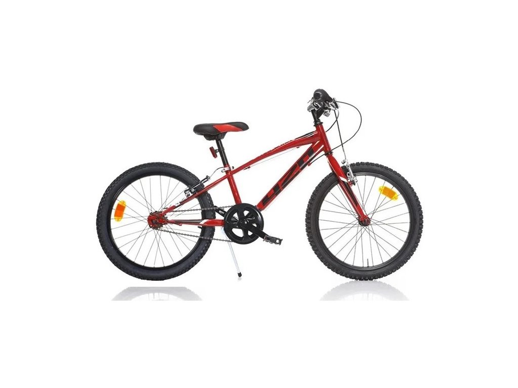 Chlapecké dětské kolo DINO Bikes - 20" Aurelia červené se vyznačuje sportovním vzhledem, nastavitelným sedlem do výšky 56-68 cm, hliníkovými ráfky a odlehčeným rámem z Hiten oceli. V-brzdy na obě kola, volnoběžka.