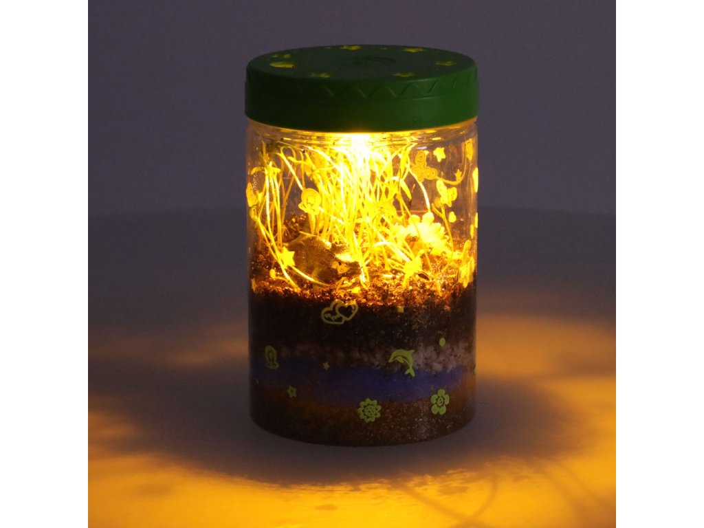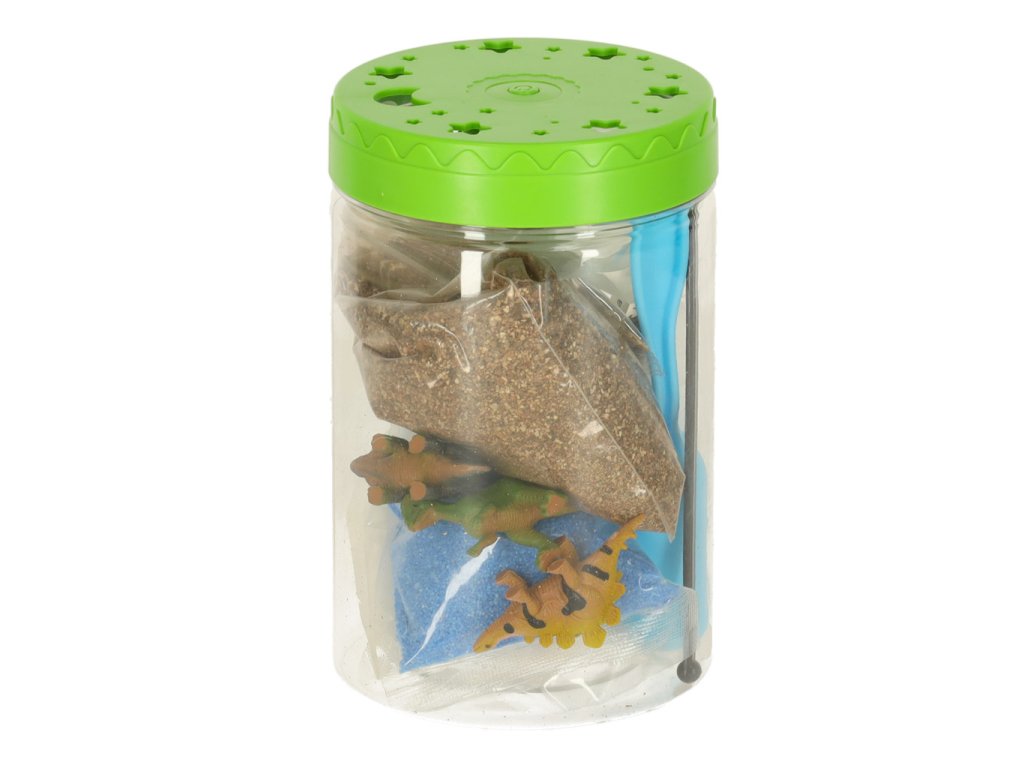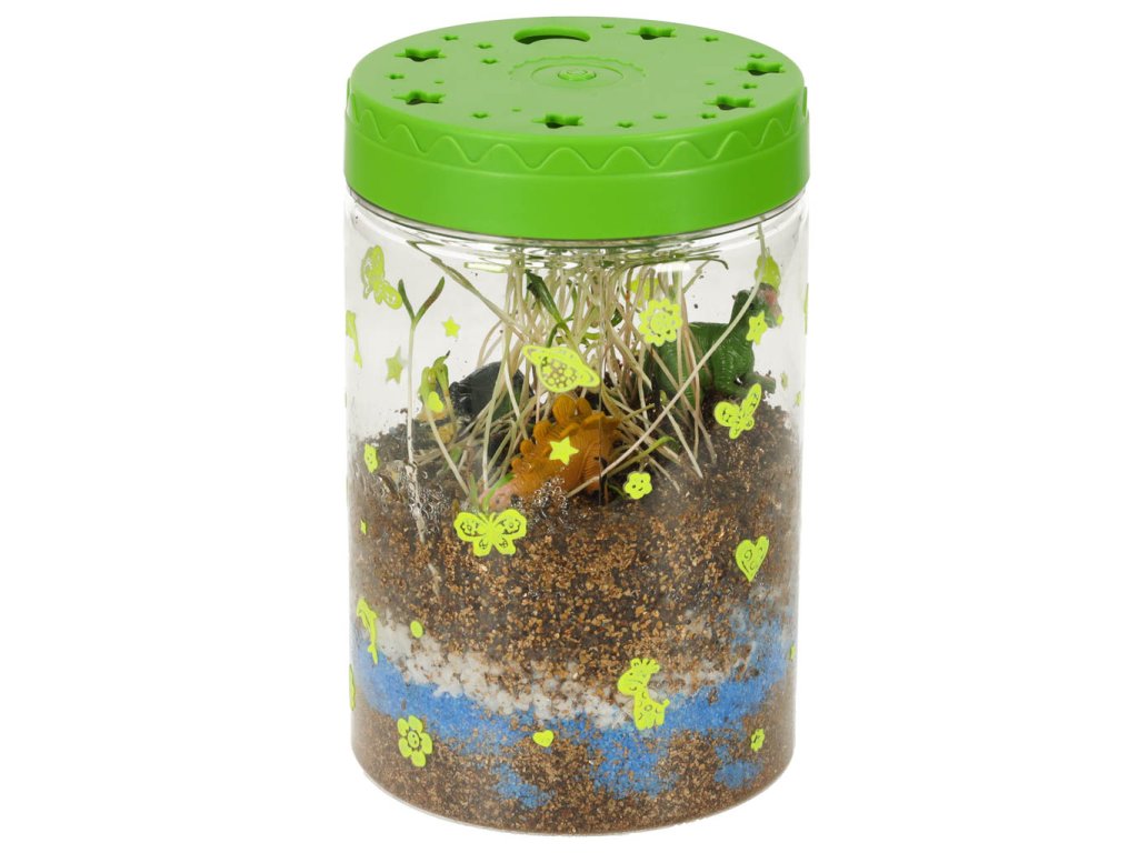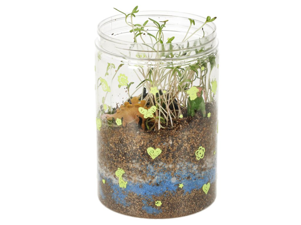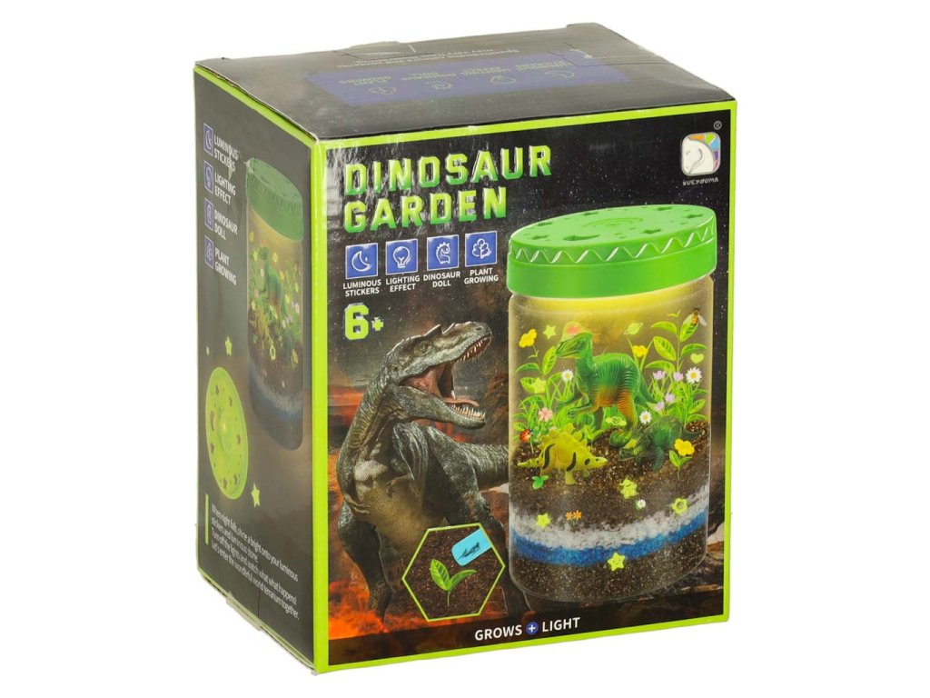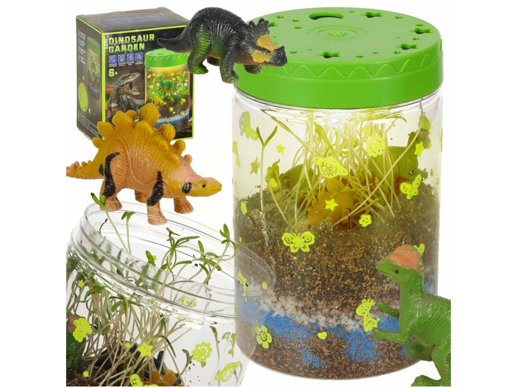 Sada „Dinosauří terárium“ je projekt, který dětem umožňuje vytvořit si vlastní mini terárium s rostlinami pro dinosaury. Sada obsahuje plastovou nádobu s víkem s větracími otvory a vestavěným LED světlem (napájeným 3 bateriemi AG3), které poskytuje rostlinám dodatečné světlo a podporuje jejich růst. Různě barevné kamínky a zemina by měly být umístěny dle návodu. Po zasazení trávy a semínka květin vytvoří přirozené prostředí pro tři dinosaury. Samolepky umožňují dětem vyzdobit si terárium podle vlastních představ. Sada podporuje rozvoj kreativity a učí základy péče o rostliny.