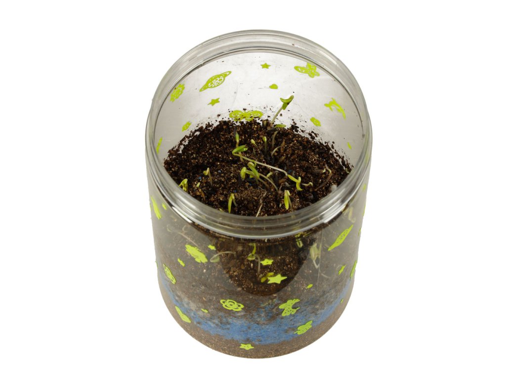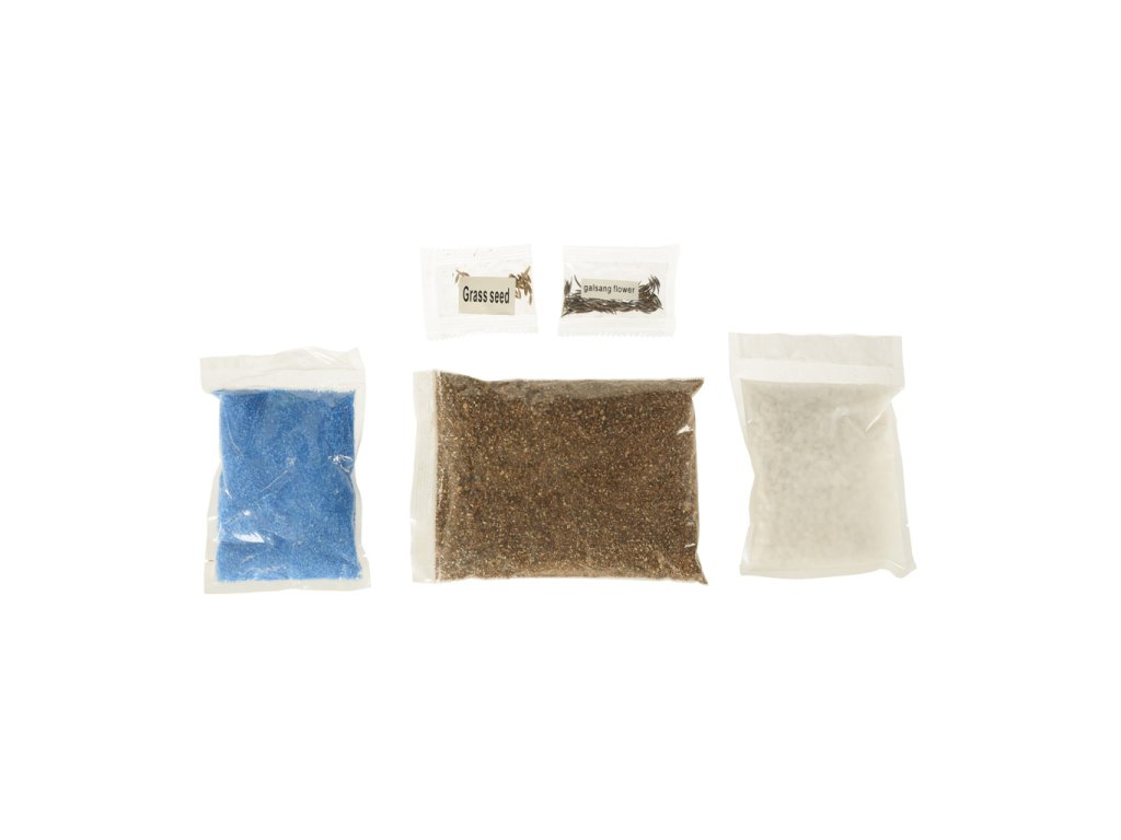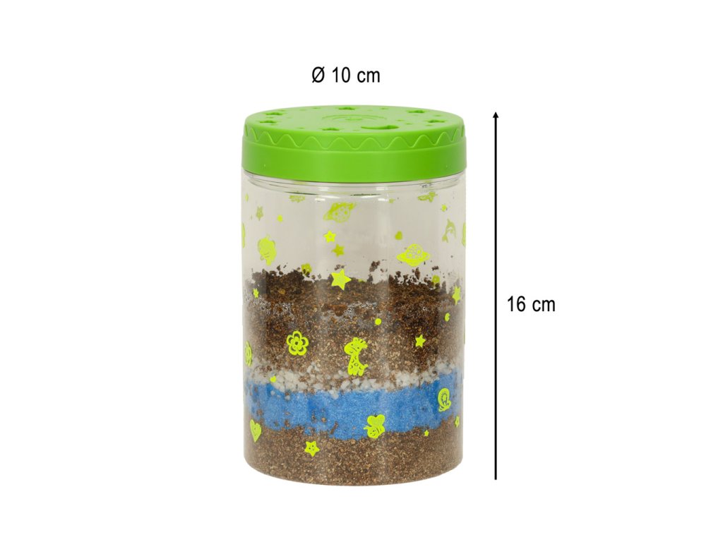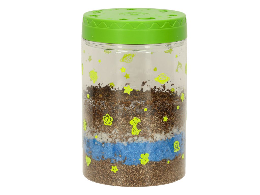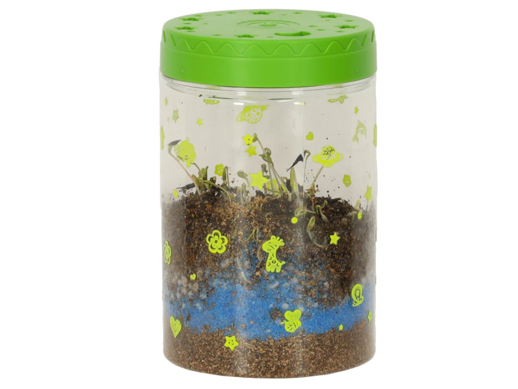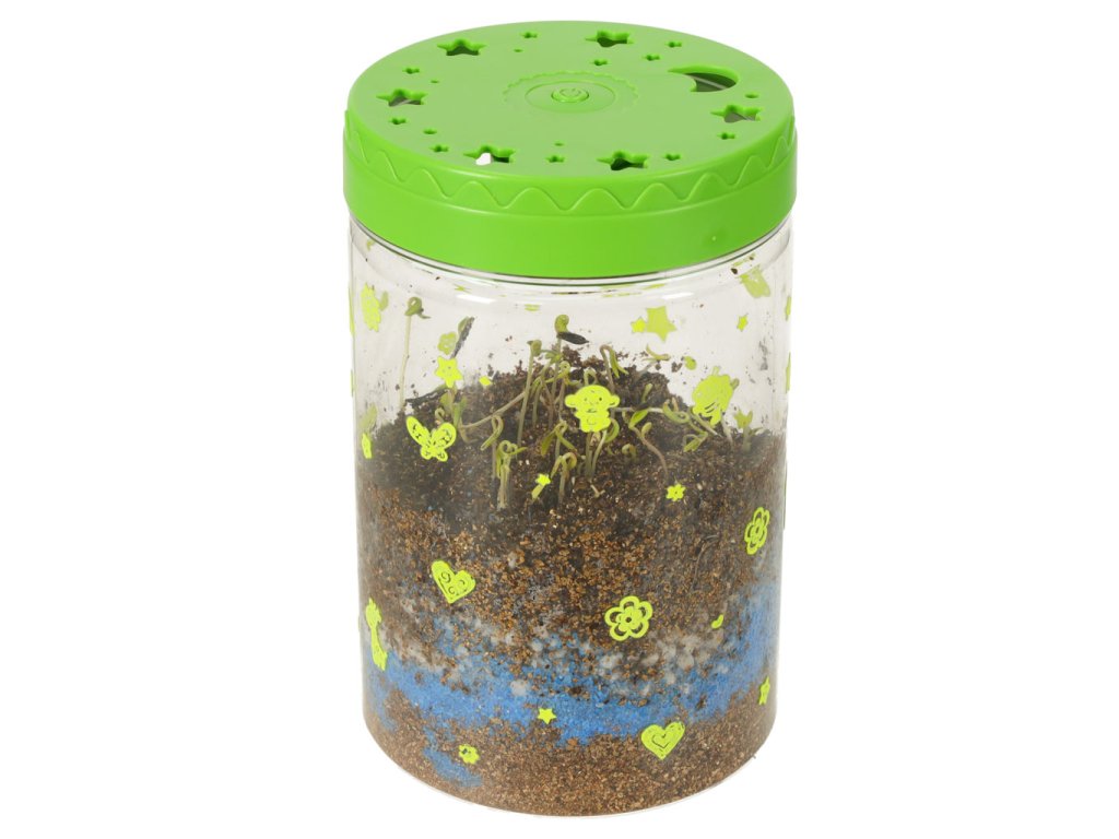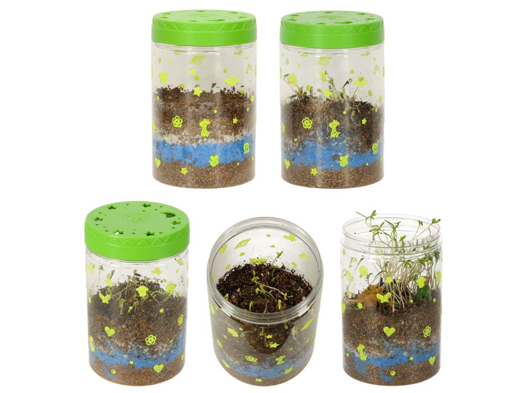 Sada „Dinosauří terárium“ je projekt, který dětem umožňuje vytvořit si vlastní mini terárium s rostlinami pro dinosaury. Sada obsahuje plastovou nádobu s víkem s větracími otvory a vestavěným LED světlem (napájeným 3 bateriemi AG3), které poskytuje rostlinám dodatečné světlo a podporuje jejich růst. Různě barevné kamínky a zemina by měly být umístěny dle návodu. Po zasazení trávy a semínka květin vytvoří přirozené prostředí pro tři dinosaury. Samolepky umožňují dětem vyzdobit si terárium podle vlastních představ. Sada podporuje rozvoj kreativity a učí základy péče o rostliny.
