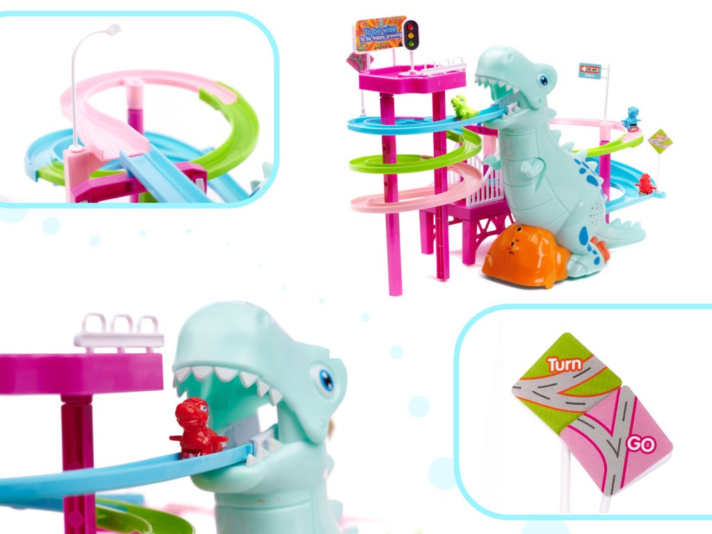 Dinosauří závodní dráha s dinosaurem, který polyká malá autíčka ve tvaru dinosaura, je pro děti skvělou zábavou.