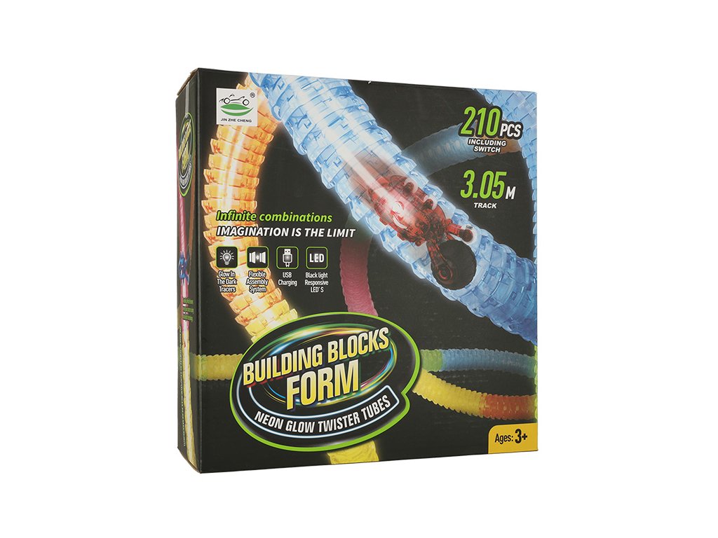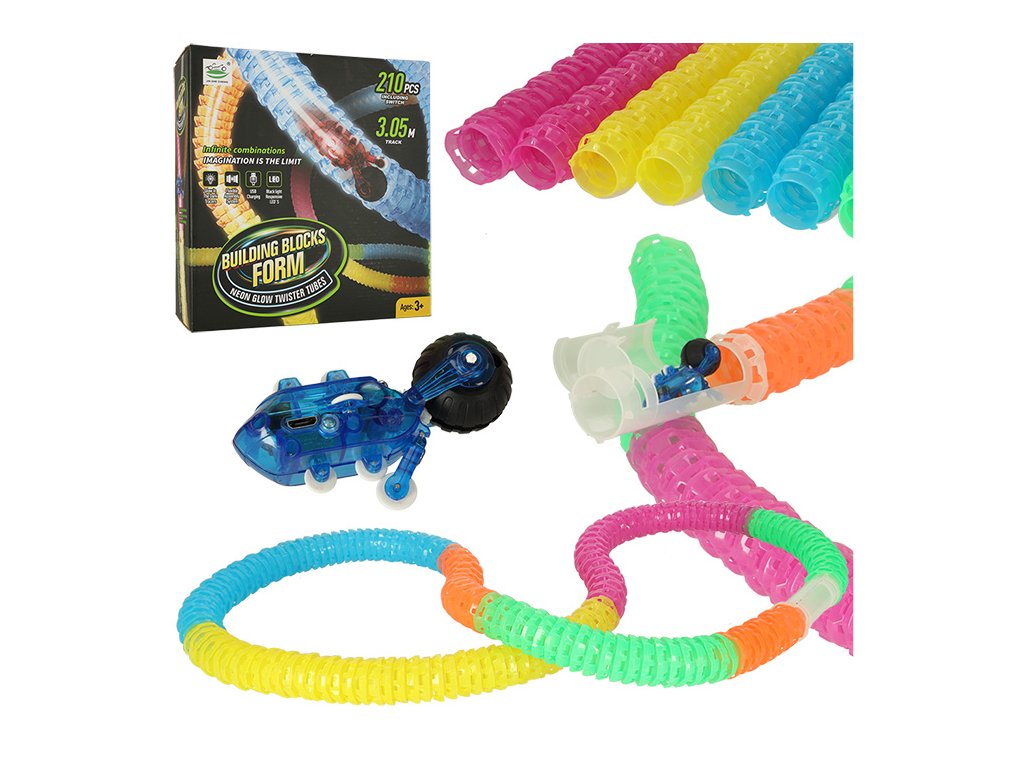Má vaše dítě chuť na hru plnou vzrušení? Na rychlou jízdu na barevné dráze? S touto sadou je to možné! Dvě stě deset dílků vytvoří neobvyklou trubkovou dráhu, po které bude autíčko jezdit závratnou rychlostí! Trubičky jsou v pěti barvách - žluté, růžové, zelené, modré a oranžové. Díky tomu je možné vytvořit zajímavou a mimořádně barevnou dráhu na hraní! Originální způsob, jakým se bloky spojují umožňuje postavit mimořádně zajímavou dráhu. Bloky lze umístit dvěma způsoby - volně, což umožňuje dráhu ohýbat a vytvářet křivky, a napevno, což vytváří vertikální struktury.