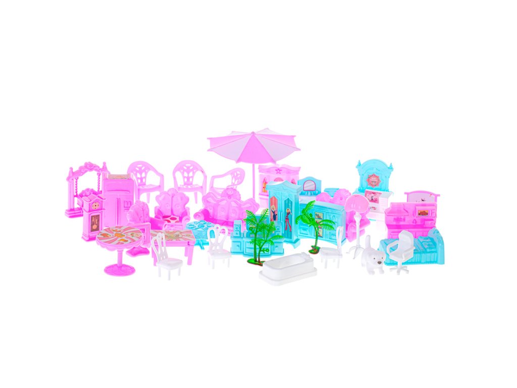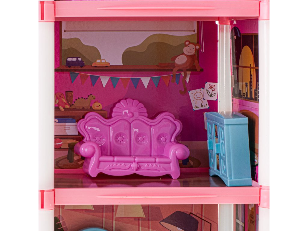 Všechny stěny a střecha domku jsou v oblíbené barvě dětí - růžové! Kromě toho jsou vnitřní stěny opatřeny grafikou s mnoha kusy nábytku a dekoracemi, které jsou nezbytné v každé domácnosti, což dodává domku realističtější vzhled. Velké množství nábytku usnadní uspořádání interiéru a učiní domeček vhodnějším pro panenky. I panenky si přece zaslouží krásný interiér, nebo ne?