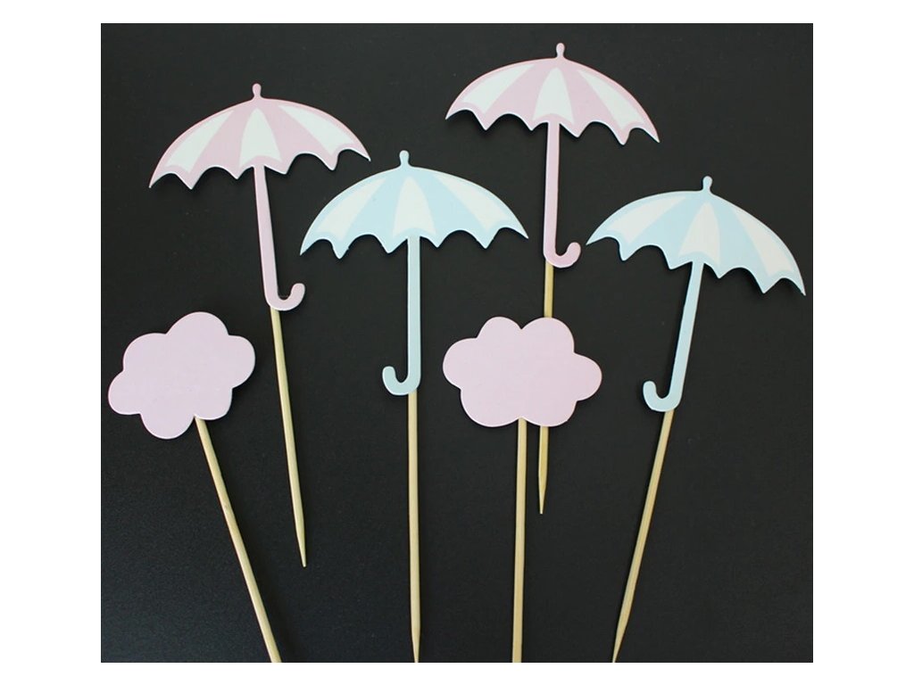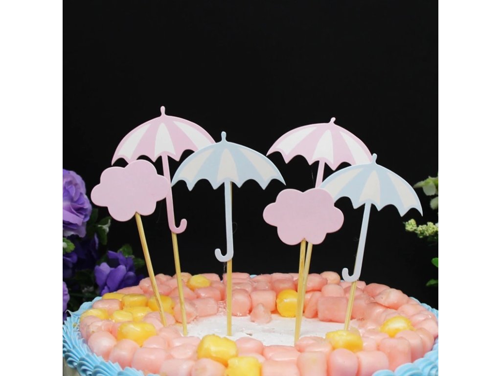 Roztomilé dortové zápichy s motivem deštníku a mraku jsou perfektní ozdobou pro narozeninové dorty, cupcakes. Ideální volba pro letní oslavy, baby shower nebo dětské párty.