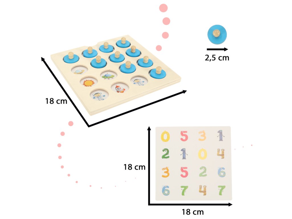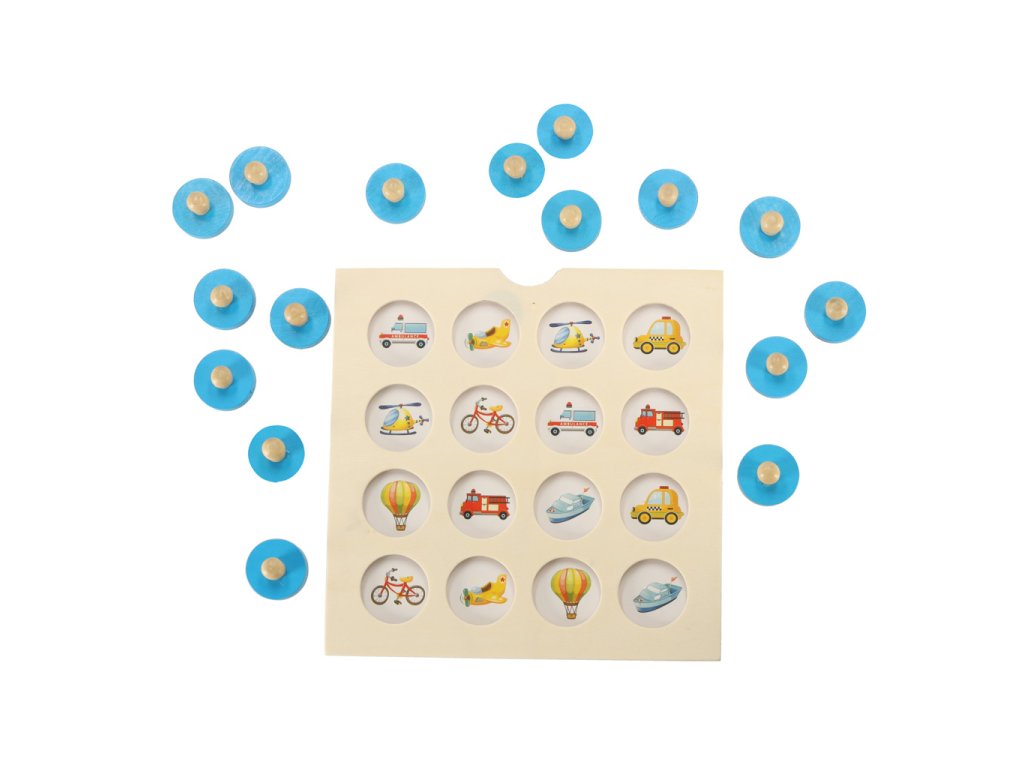 Dřevěná pexeso hra je skvělou příležitostí, jak zábavnou formou rozvíjet vnímavost a paměť dítěte! Cílem hry je najít dva stejné obrázky odkrytím dvou modrých kostek v každém tahu. Za každou shodnou dvojici obrázků dítě získává body.