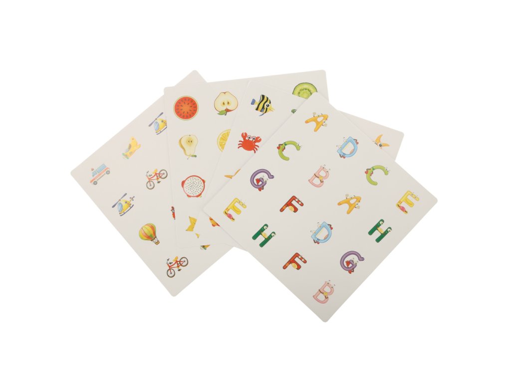 Sada obsahuje čtyři oboustranné karty s různými ilustracemi, díky čemuž je každá hra jiná a stejně poutavá. Díky tomu se dítě nemusí učit obrázky nazpaměť, což hře dodává prvek výzvy.