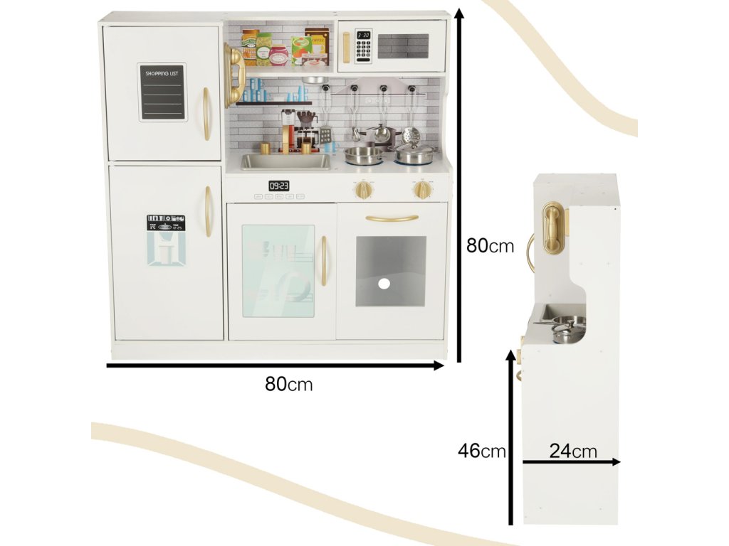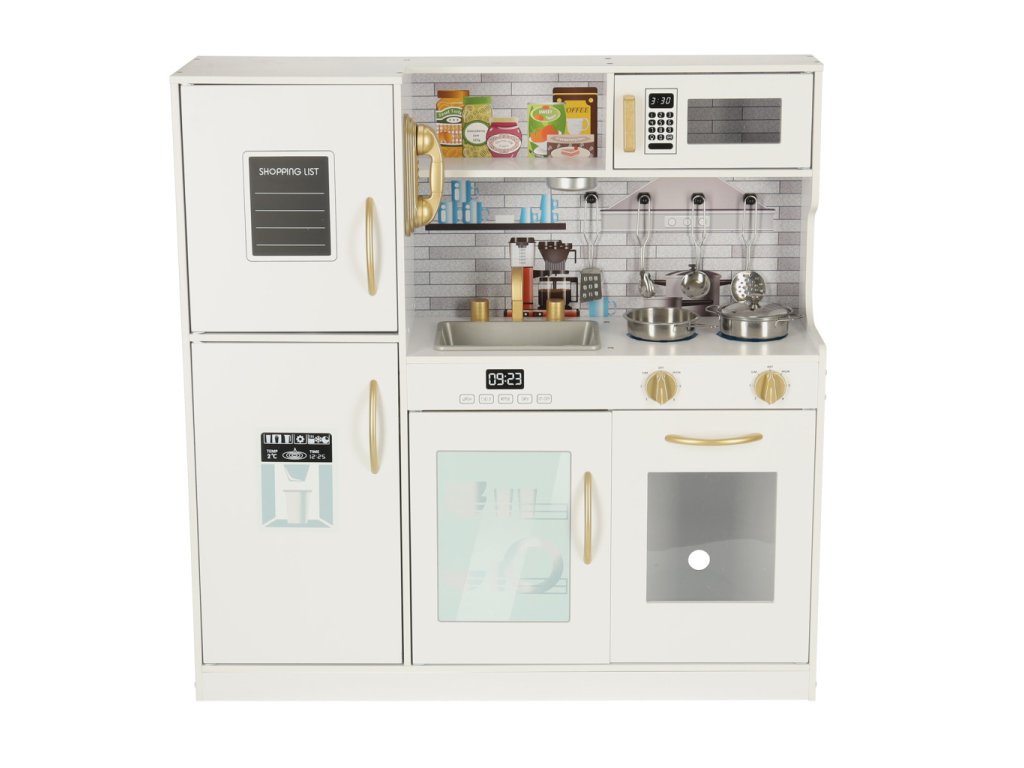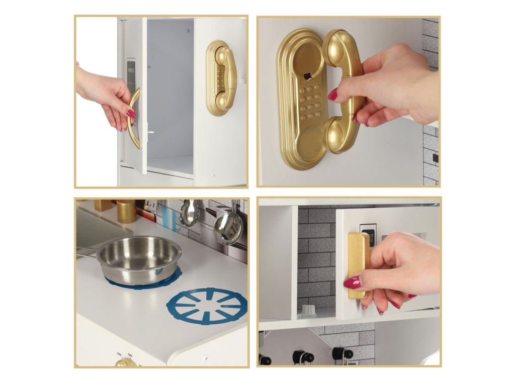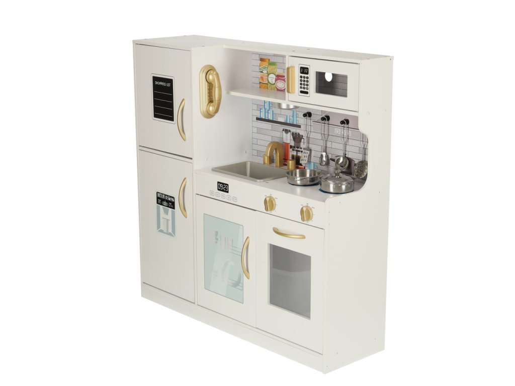 Kuchyň je bílá se zlatými prvky, díky nimž se celý produkt dokonale hodí do každé místnosti a poskytne nejen herní koutek, ale i velkolepou dekoraci.