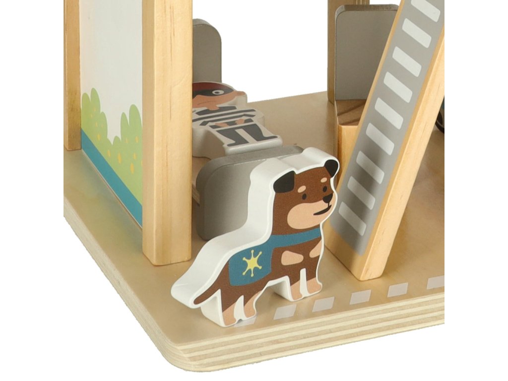 Dřevěná policejní stanice je perfektní hračkou pro malé milovníky pořádku a bezpečí! Sada obsahuje vše potřebné k vytvoření nejrůznějších herních scénářů – figurku policisty, zloděje a vycvičeného psa, a také řadu nábytku a vozidel: policejní auto a vrtulník. Policejní stanice je třípatrová a má garáž, kancelář a přistávací plochu pro vrtulníky. Všechny prvky jsou vyrobeny z hladce broušeného dřeva a natřeny netoxickými barvami.