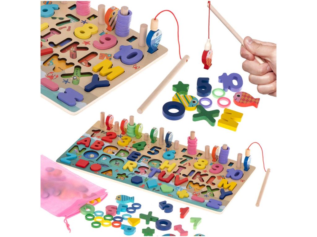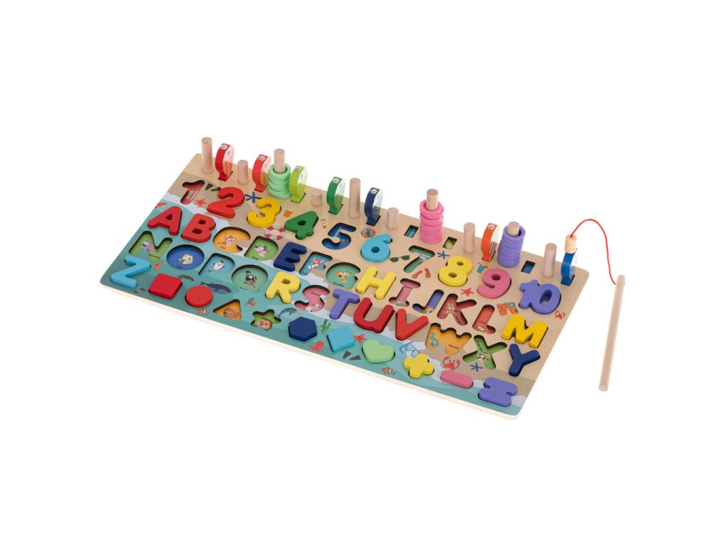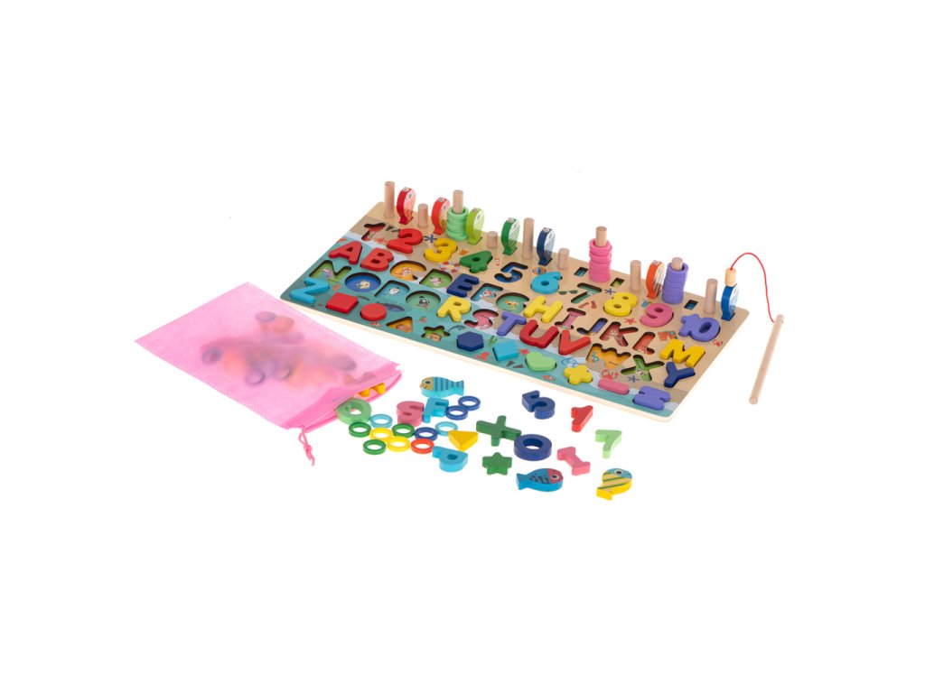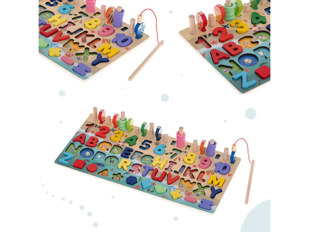Dřevěná vkládačka s abecedou, tvary, čísly a lovením rybek 3v1