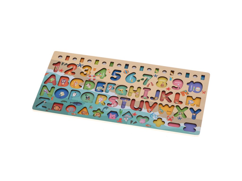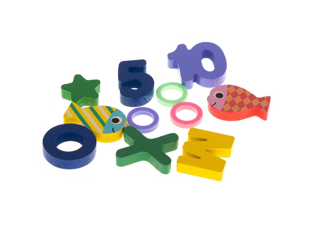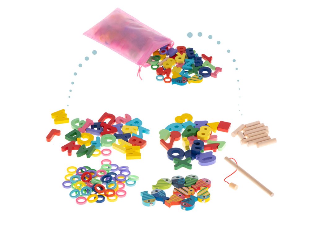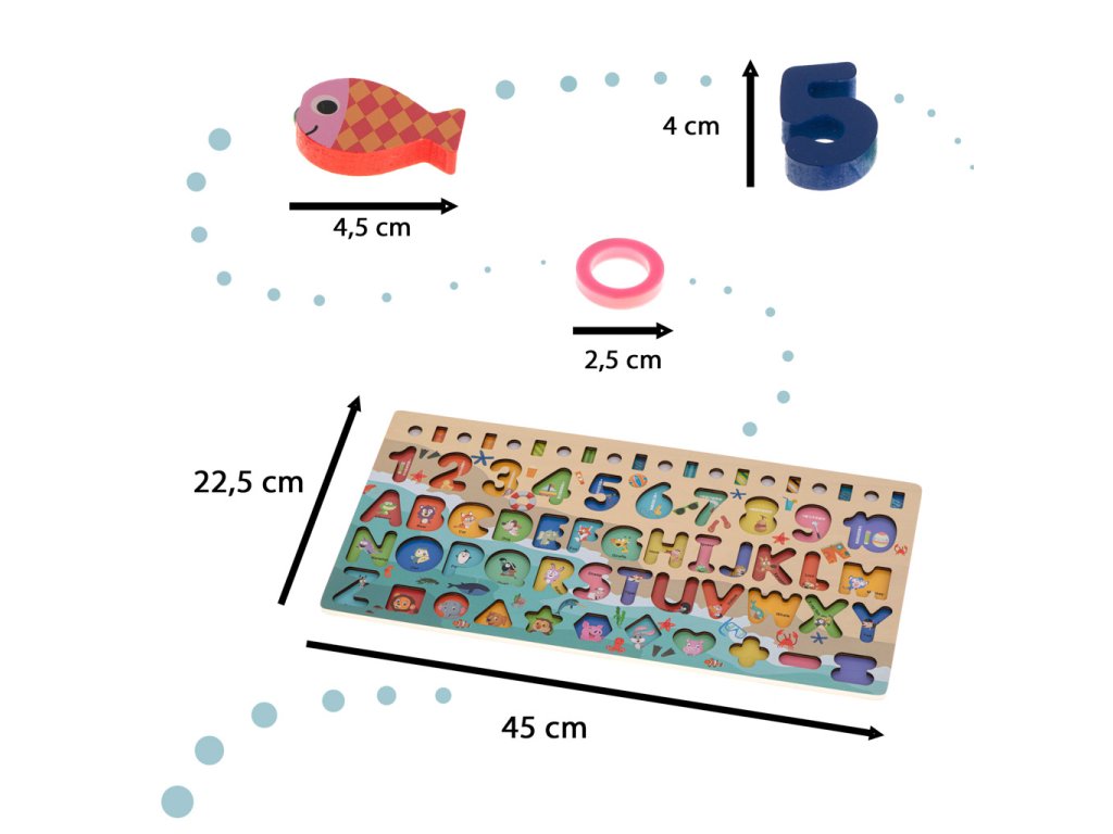 Dřevěná vkládačka s abecedou, tvary, čísly a lovením rybek 3v1