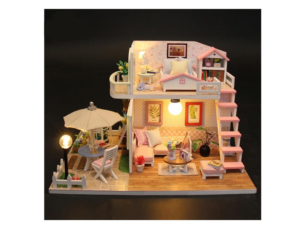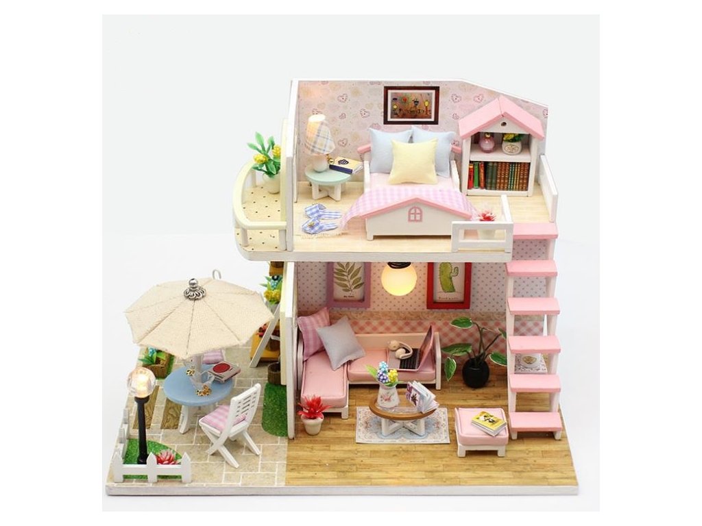 Dřevěný domeček pro panenky - dvoupatrový model k sestavení, LED diody