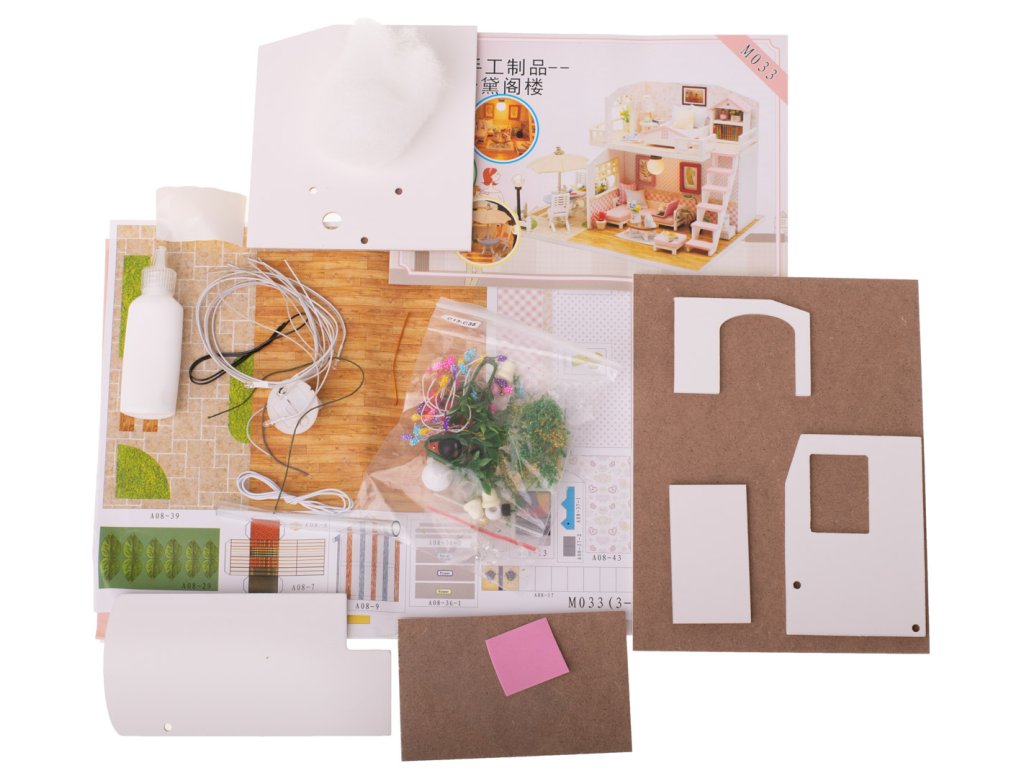 Domek je plný detailů a jeho interiér je osvětlen dvěma LED světly na baterie (nejsou součástí sady), což mu dodává realistický nádech.