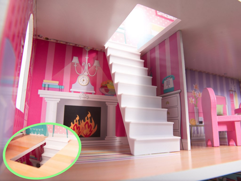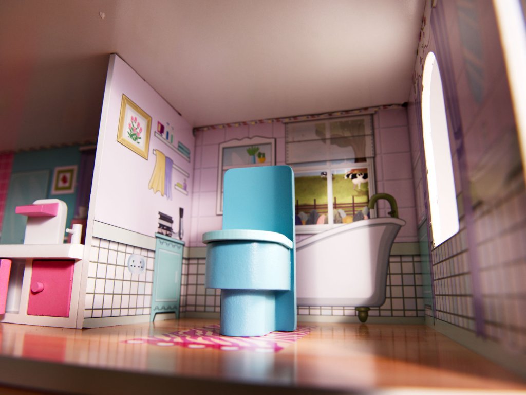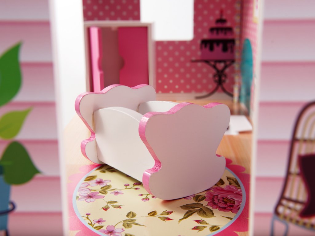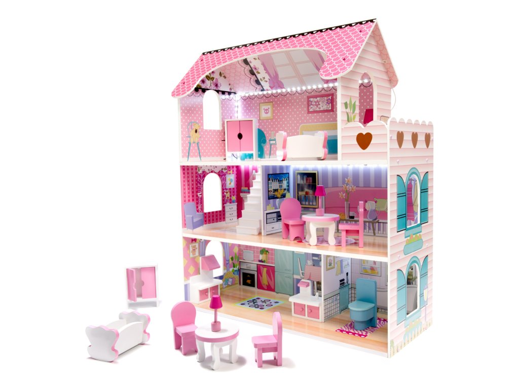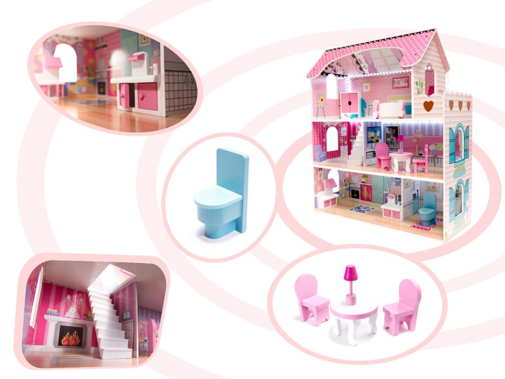 Dřevěný domeček pro panenky se skládá ze tří pater s pěti místnostmi: kuchyní, koupelnou, ložnicí, obývacím pokojem a chodbou. Sada obsahuje LED pásek napájený AA bateriemi, který se instaluje do domečku. Barevná grafika na stěnách a dřevěný nábytek děti nadchnou pro hraní.