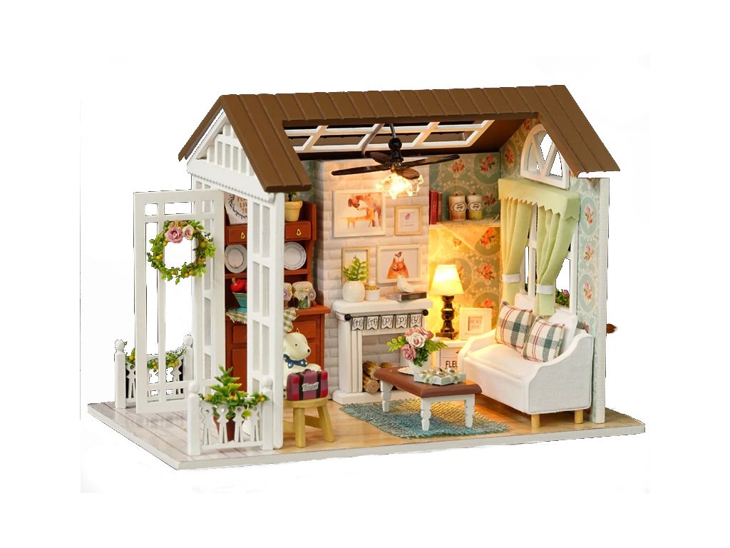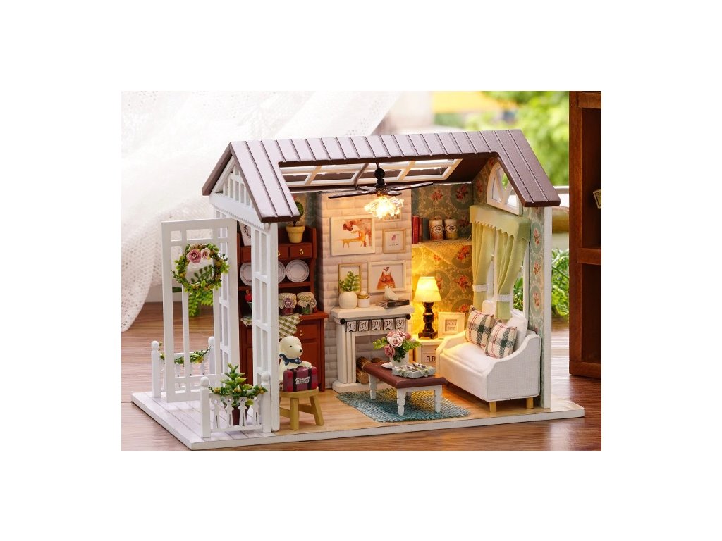 Dřevěný obývací pokoj pro panenky k sestavení, LED osvětlení