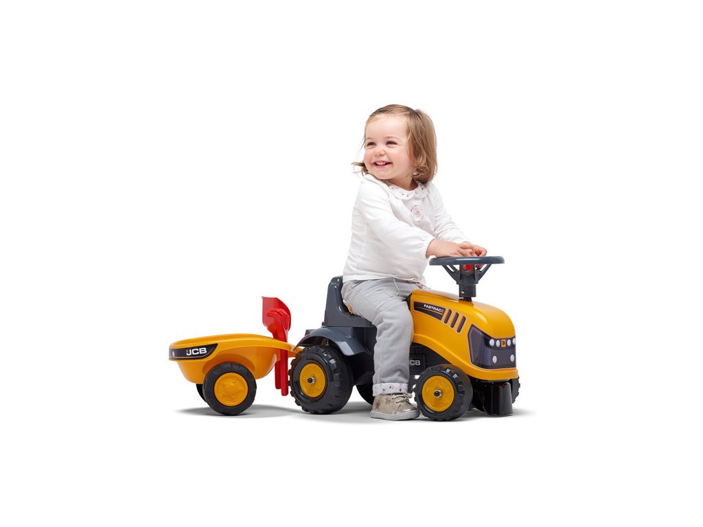 Dětské odrážedlo Falk Baby JCB s vlečkou, lopatkou a hráběmi. Kopie známé značky traktoru z plastu. Odrážedlo je vyrobené ve Francii z vysoce kvalitního odolného plastu s ohledem na bezpečnost dětí. Klakson na volantu. Pro děti od 1 do 3 let.