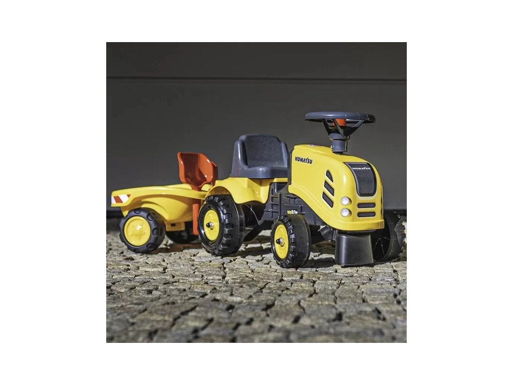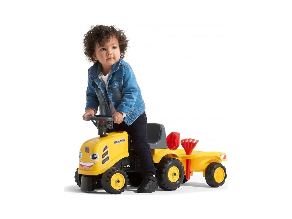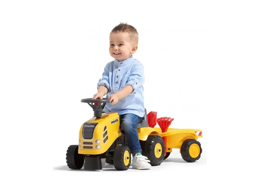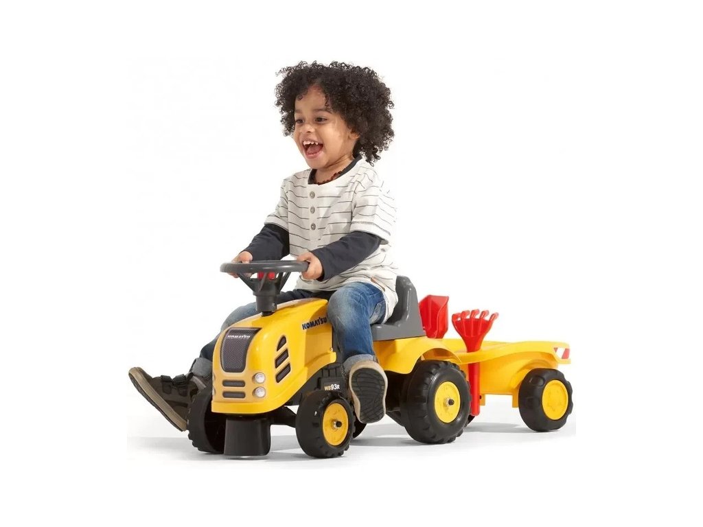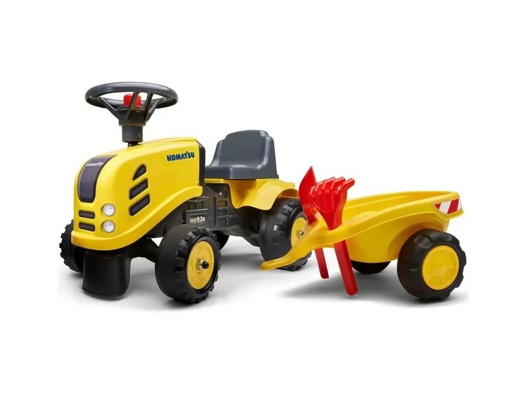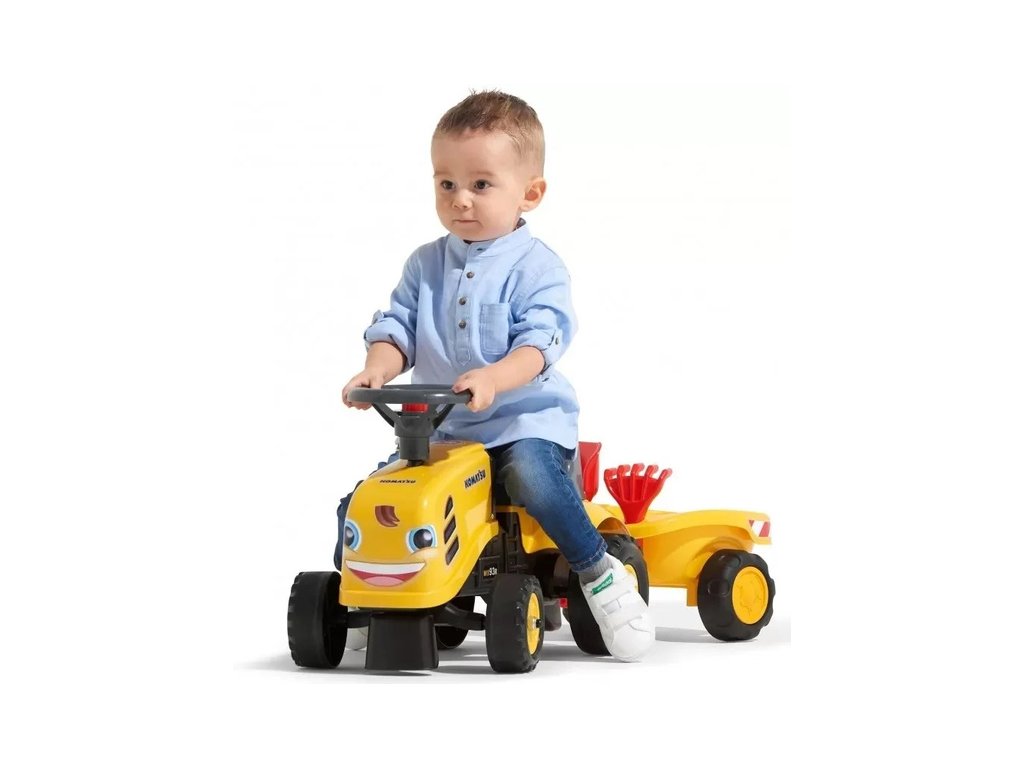 Dětské odrážedlo Falk Baby Komatsu s vlečkou, lopatkou a hráběmi. Kopie traktoru z plastu pro děti. Odrážedlo je vyrobené ve Francii z vysoce kvalitního odolného plastu s ohledem na bezpečnost dětí. Je vybaveno klaksonem na volantu. Pro děti od 1 do 3 let.